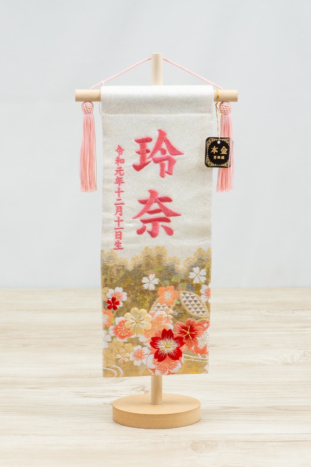 名前旗 ひな祭り 女の子 雛人形用 飾り付けサイズ 高さ38×横幅16.5×奥行9cm 旗のサイズ 高さ29×幅11㎝ 箔を織り込んだベージュ金襴に流水小桜柄の上に 本金とダイヤ箔の金彩施しさらに桜柄を刺繍した 贅沢なお名前旗 名前と生年月日の刺繍はローズ色のオシャレな刺繍です お名前と生年月日を金色の刺繍にてお作りいたします。 【字体等はメーカーのフォントに順次ますのでご了承ください】 下記のお名前と生年月日【あり】を選択後 それぞれ記入例に従い入力お願いいたします 【3月3日までのお届けご希望の注文期日は 2月19日までの注文分までです】
