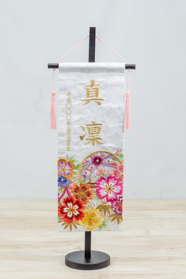 名前旗 ひな祭り 女の子 雛人形用 飾り付けサイズ 高さ57.5×横幅21×奥行11.5cm 旗のサイズ 高さ41.5×幅16㎝ 白地に薄紫の桜を織り込んだ金襴に 着物の帯地柄から取り込んだ【まりとなでしこ】柄を 金彩と刺繍で描いた美しく豪華な名前旗です。 お名前と生年月日を金色の刺繍にてお作りいたします。 【字体等はメーカーのフォントに順次ますのでご了承ください】 下記のお名前と生年月日【あり】を選択後 それぞれ記入例に従い入力お願いいたします 【3月3日までのお届けご希望の注文期日は 2月19日までの注文分までです】
