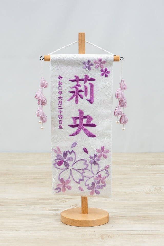 名前旗 ひな祭り 女の子 雛人形用 飾り付けサイズ 高さ39×横幅17×奥行10cm 旗のサイズ 高さ28×幅13.5㎝ 白地に小桜を織り込んだ金襴に 流水に桜柄を紫とピンク刺繍で描いた 名前旗です。 桜の花の中心にキラリと光るラインストーン付き 旗の左右の房はピンクの桃形の房で可愛く演出 お名前と生年月日を金色の刺繍にてお作りいたします。 【字体等はメーカーのフォントに順次ますのでご了承ください】 下記のお名前と生年月日【あり】を選択後 それぞれ記入例に従い入力お願いいたします 【3月3日までのお届けご希望の注文期日は 2月19日までの注文分までです】