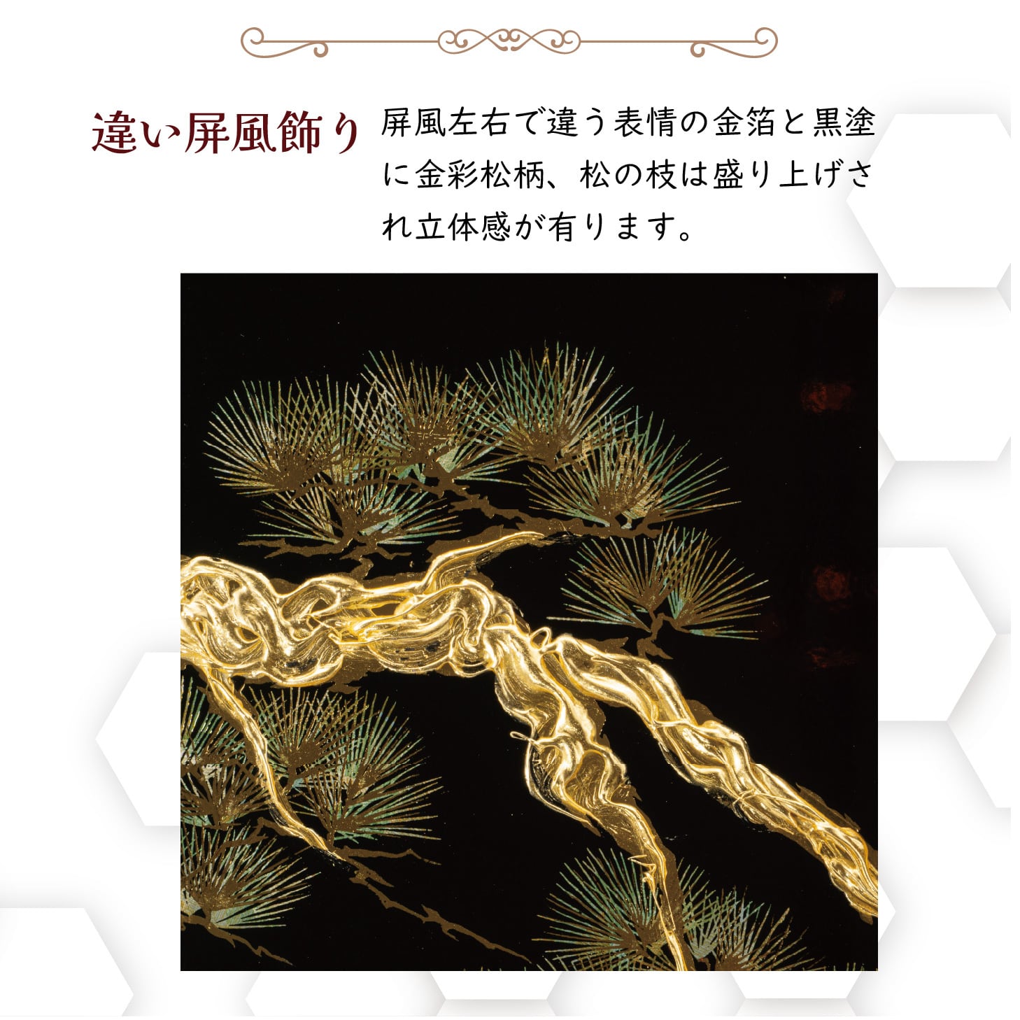 違い屏風の片方は金箔、もう一方は黒塗りに金彩の盛り上げ松を描きました。弦走り胴の本格鎧を現代的なデザイン屏風に飾りました。