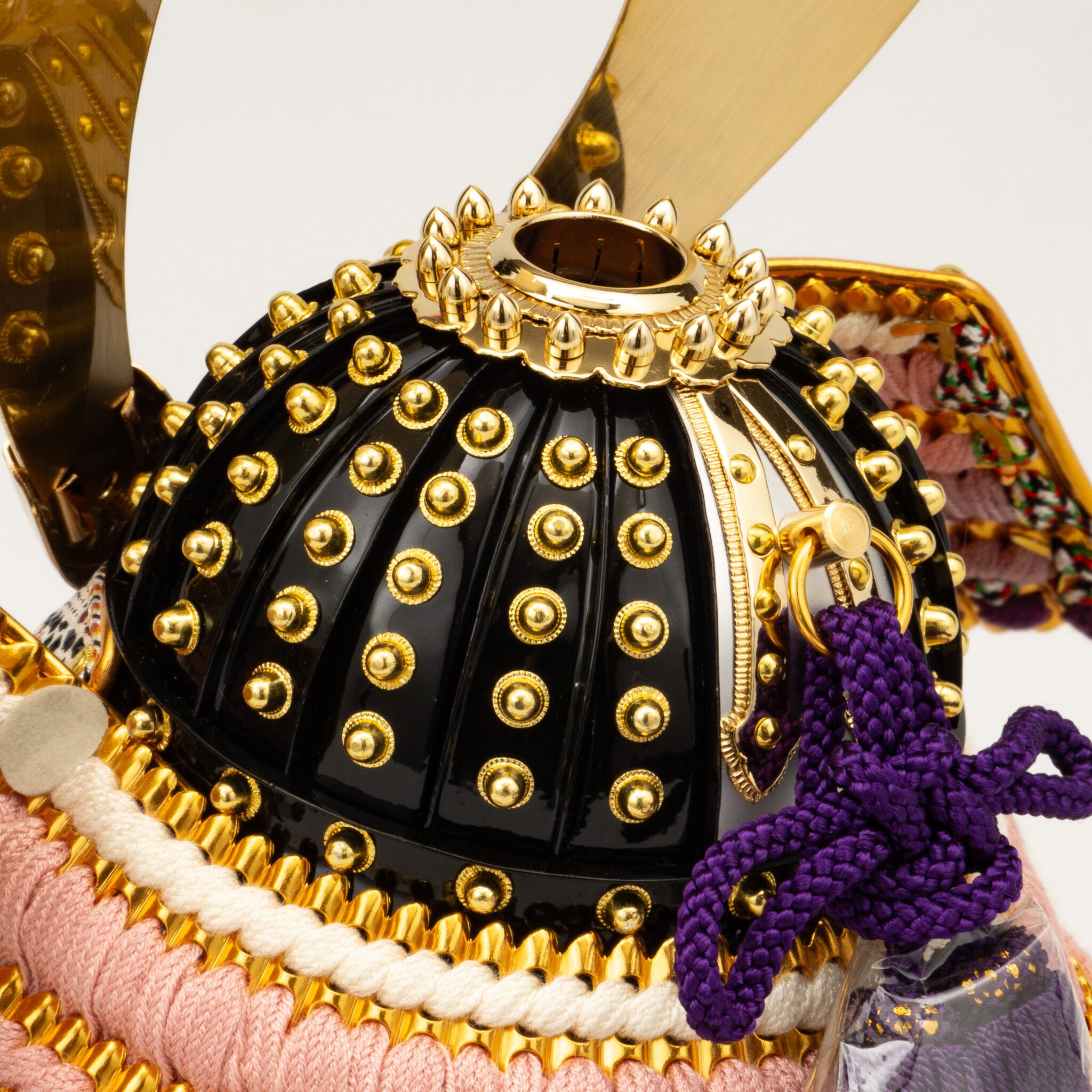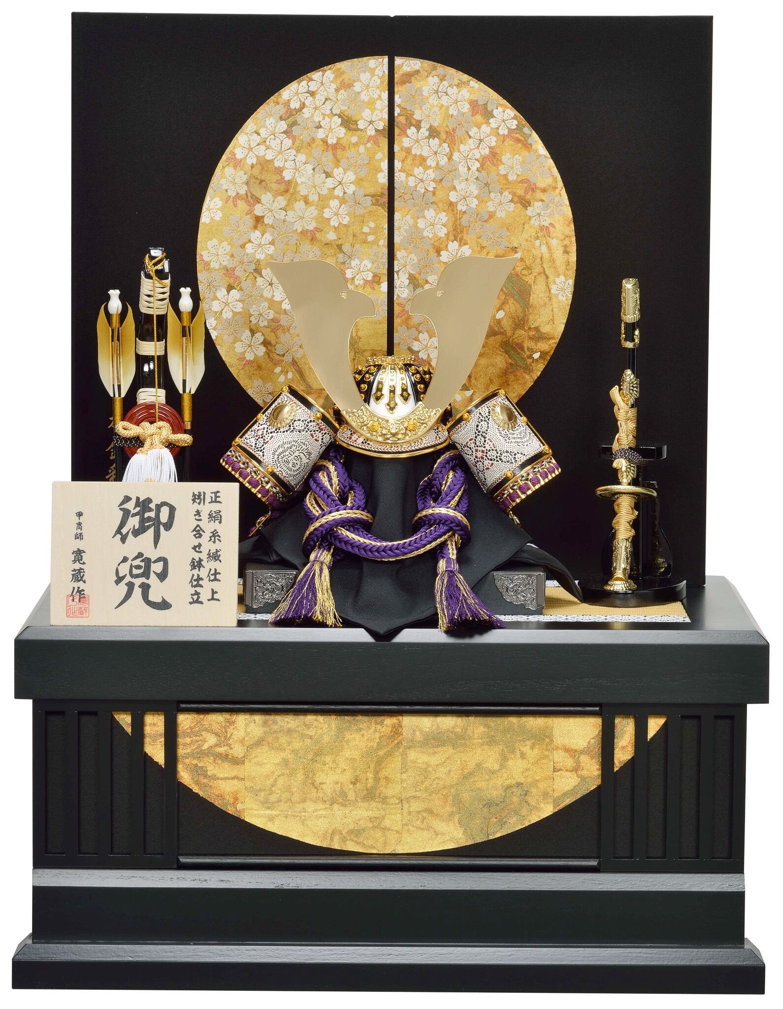 丁寧な作りの本格的な合わせ鉢に鋲打ち仕上げの兜。縅糸を紫のグラデーションで編み上げた高級品。収納台と屏風にはシルキーブラック地に金彩の月光に桜が華やか