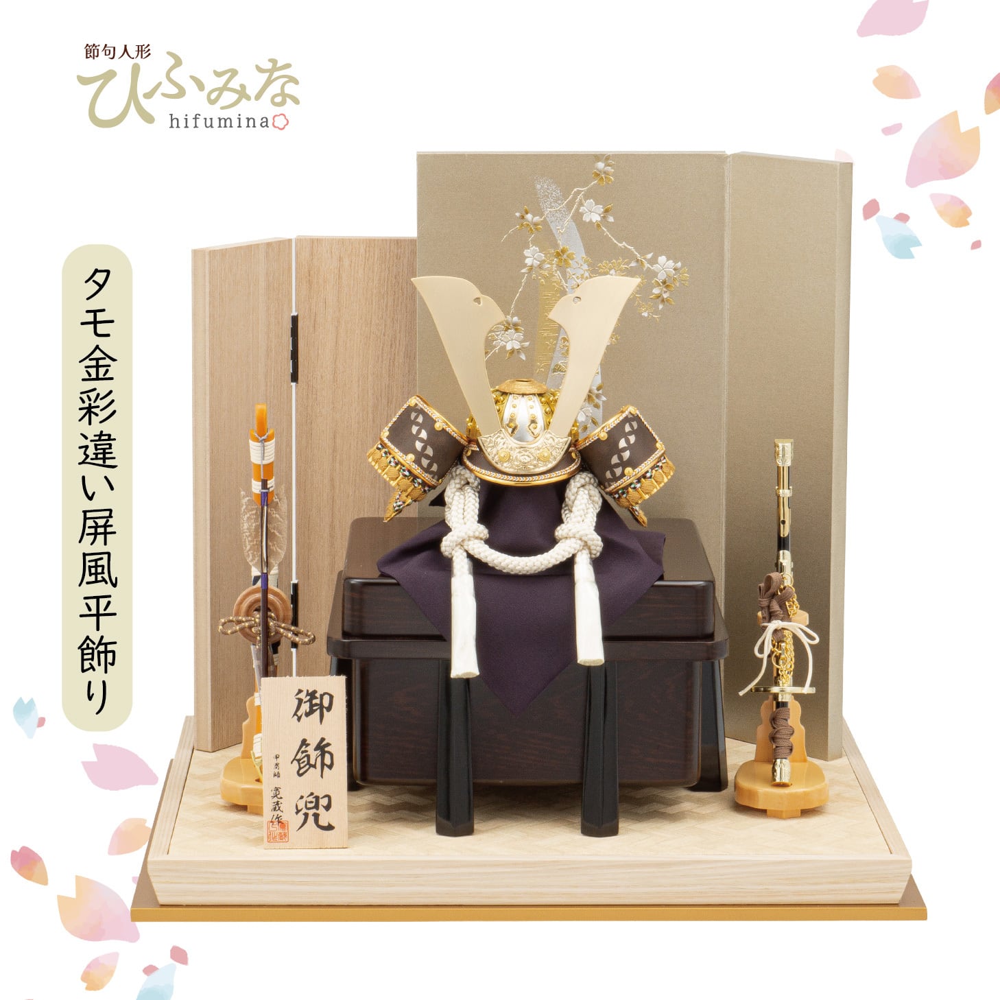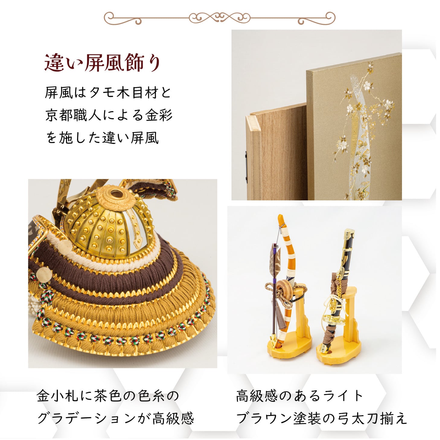 兜の鉢を金塗に仕上げ、縅糸を茶色系で仕上げ、吹返しに茶に金彩の銀杏文様、櫃を茶木目塗を使い柔らかな中に高級感のあるオリジナルの櫃付きの兜。屏風もオリジナルの違い屏風でタモ材とシャンパンゴールド色の箔に京金彩を描き、平台はタモ材と金塗を使い色彩をトータルにコーディネートした飾りです。