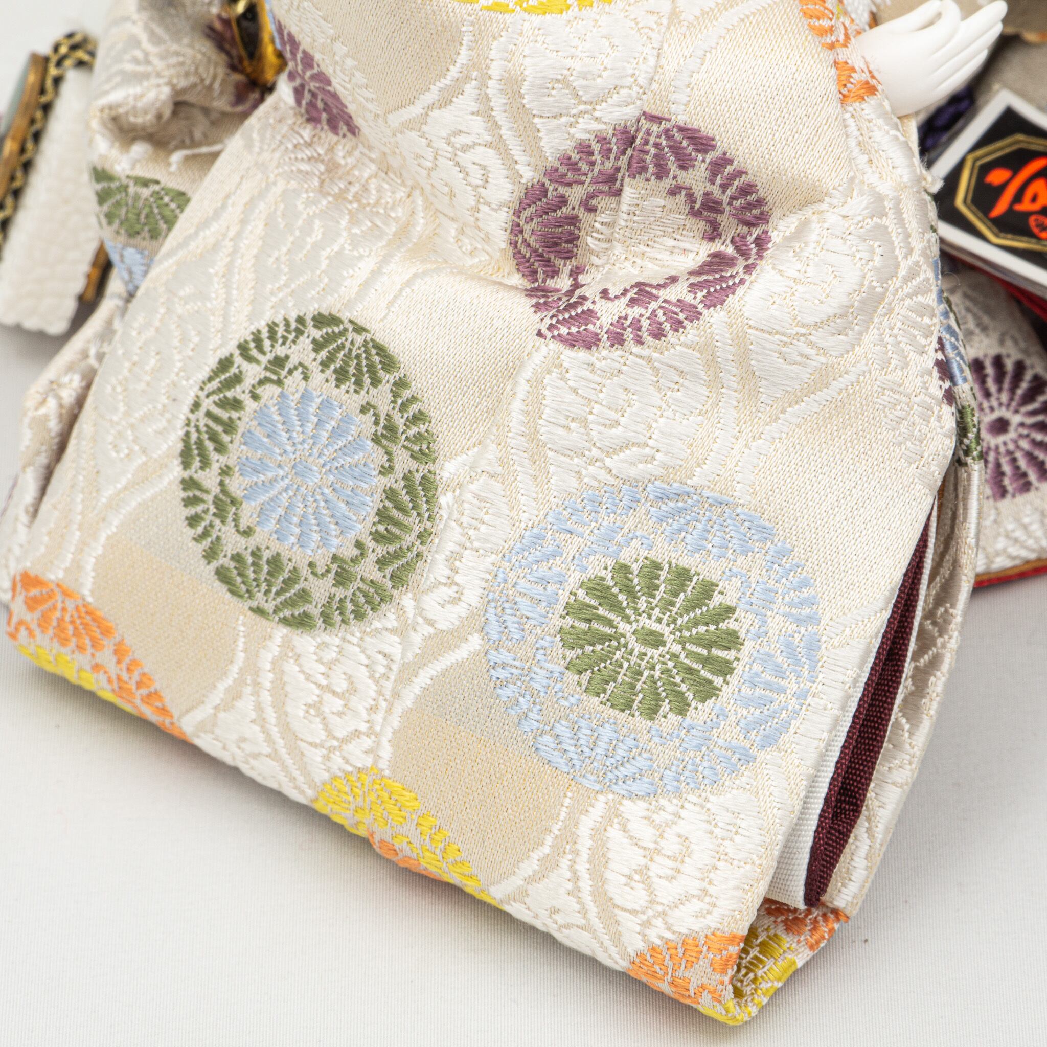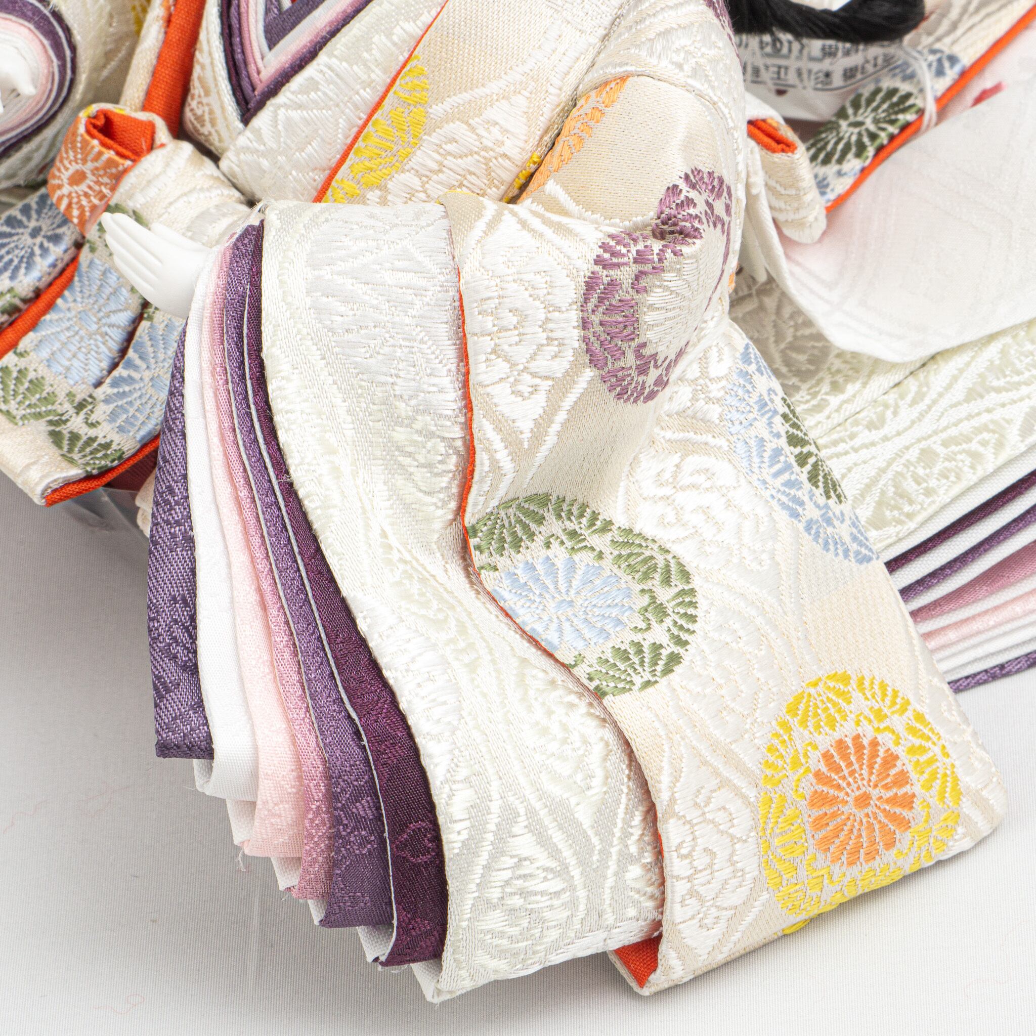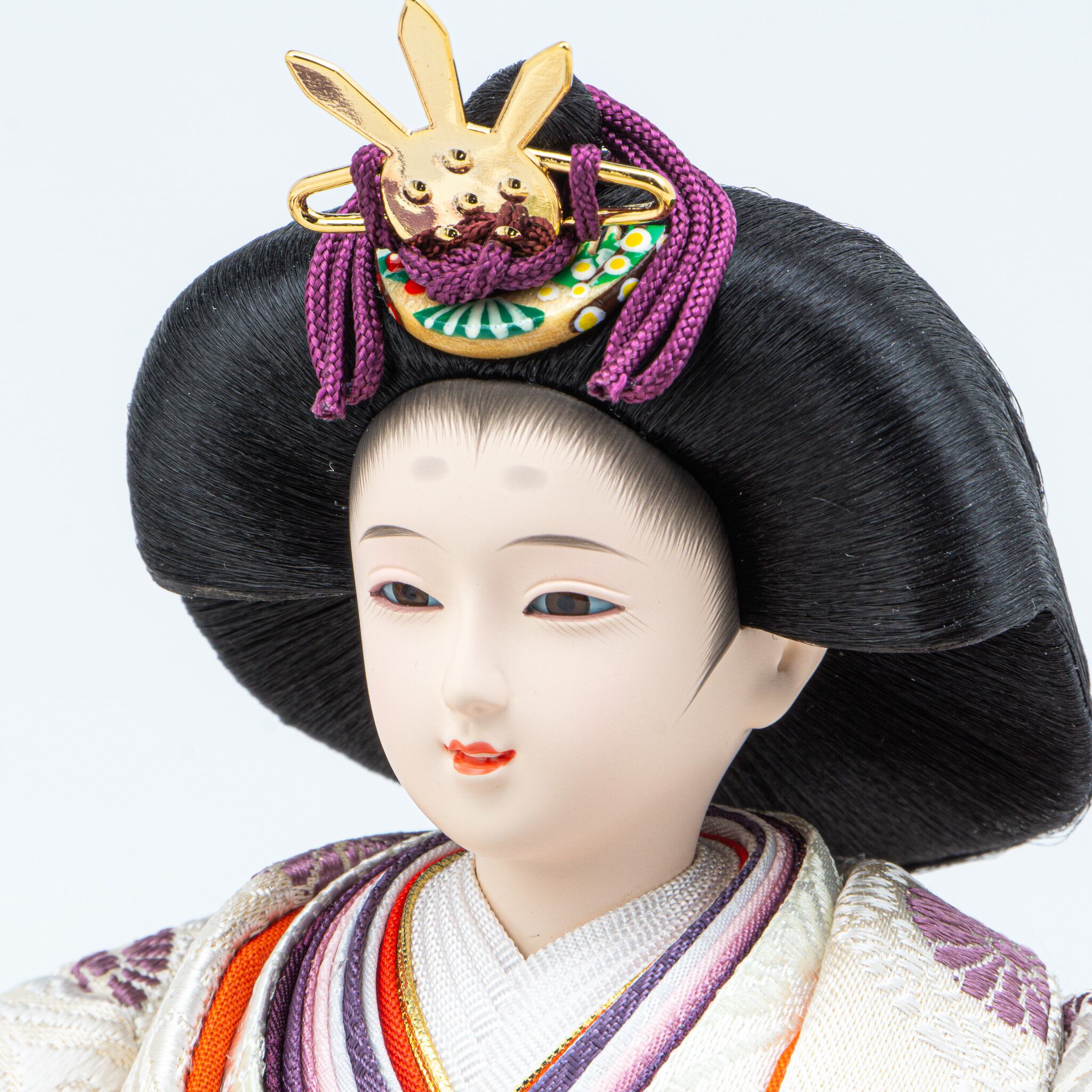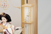 天板を二重に仕立てたことで、高級感を醸し出しています。ナチュラルな色合いの飾り台は落ち着きがあり、刺繍が繊細に施されたお屏風と調和して、シンプルながらも優雅な華やかさを添えています。衣装には正絹(シルク)を使用し、京都西陣織金襴の贅沢な生地をまといました。紫のグラデーションが美しい十二単衣は、伝統を的な重ね仕立てで仕上げられ、品格ある優しい表情の人形が、気品と温もりを感じさせる逸品となっています。