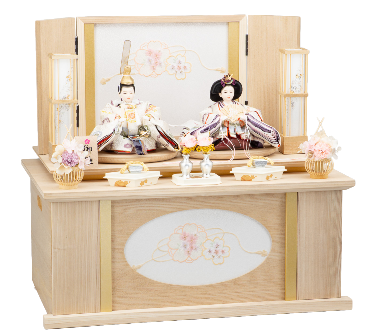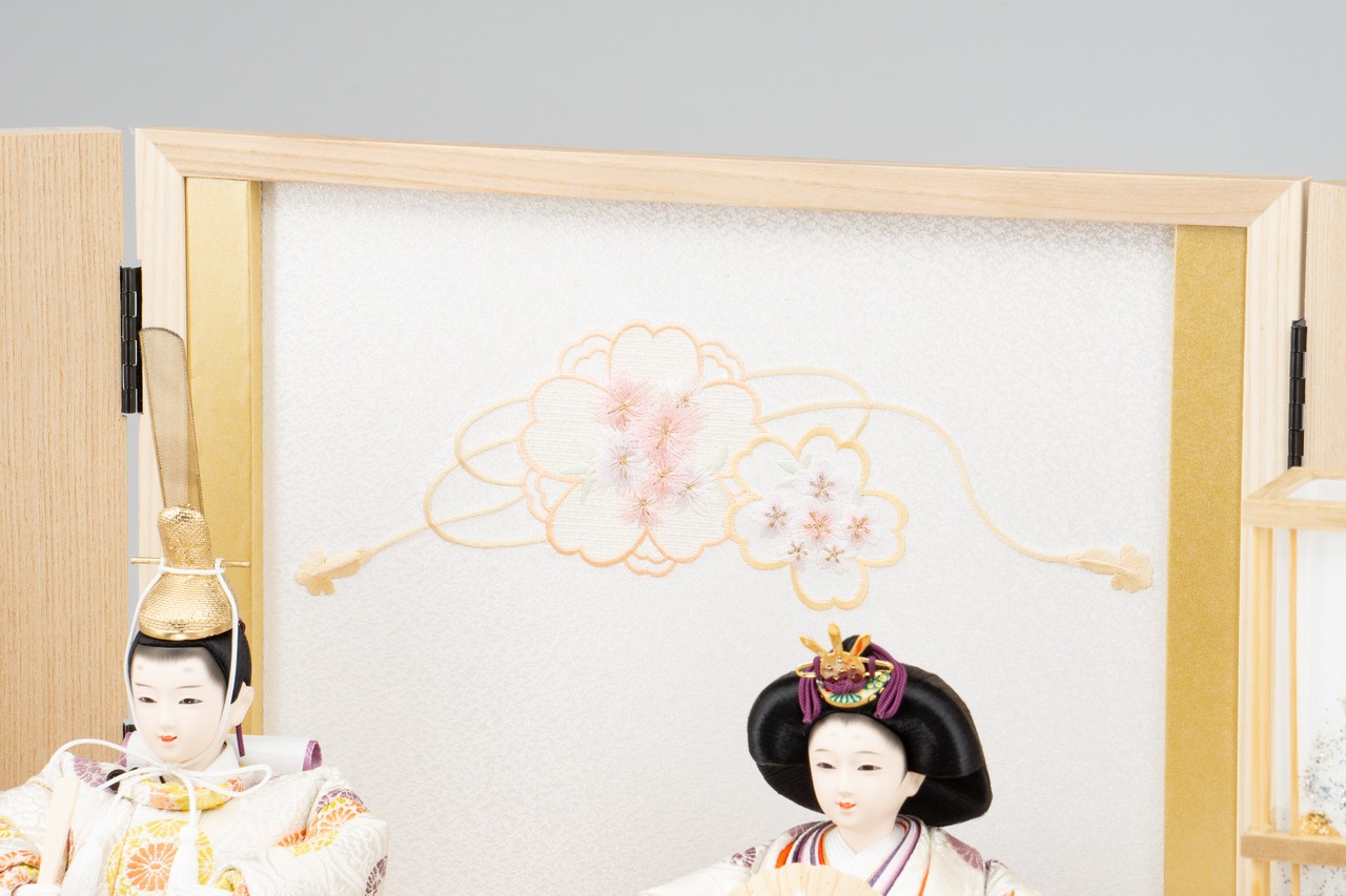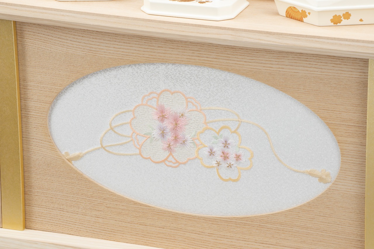 26S-01 彩鳳正絹 二人飾り 天然木タモ リボンに桜刺繍 収納飾りセット