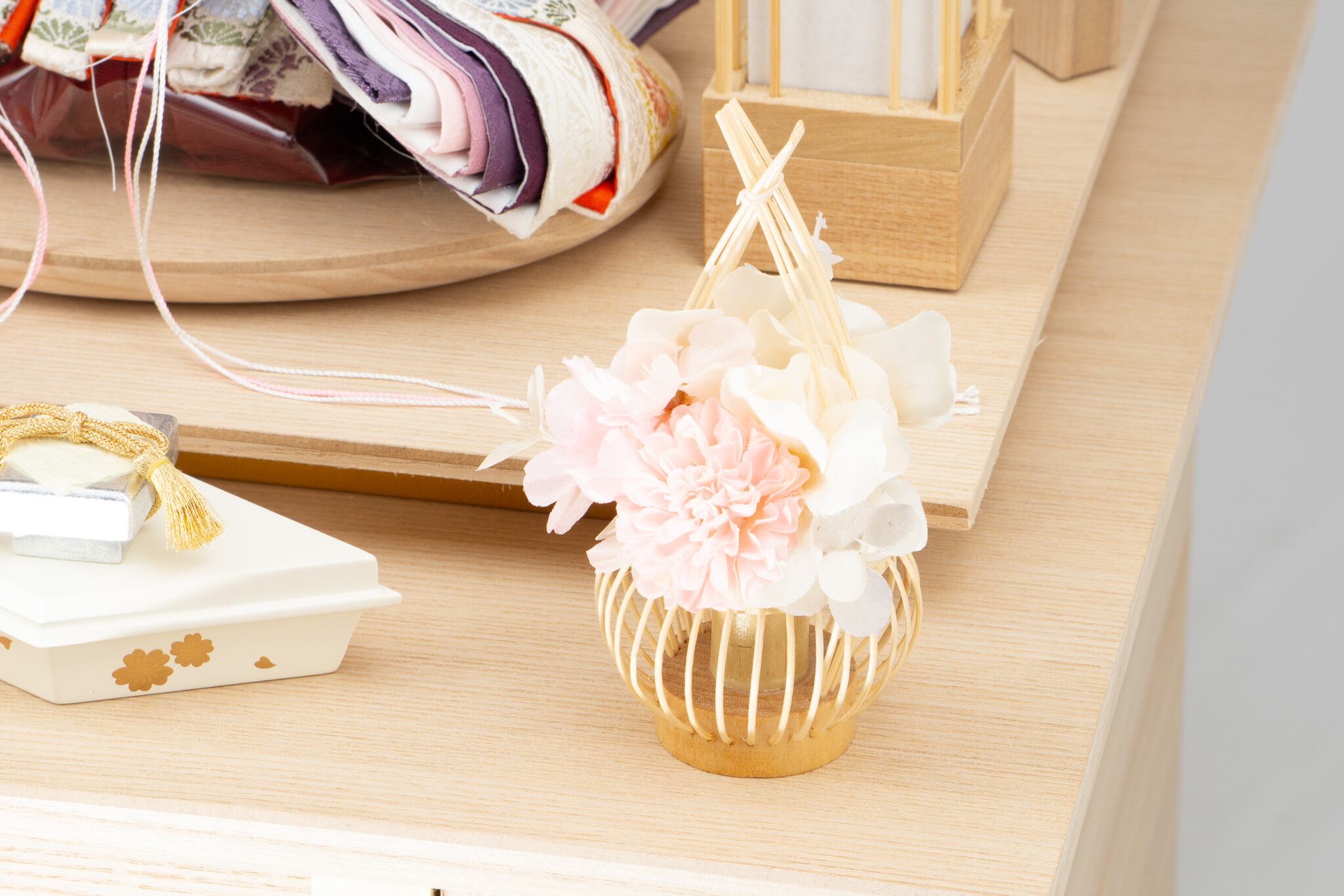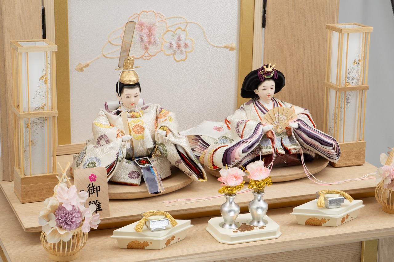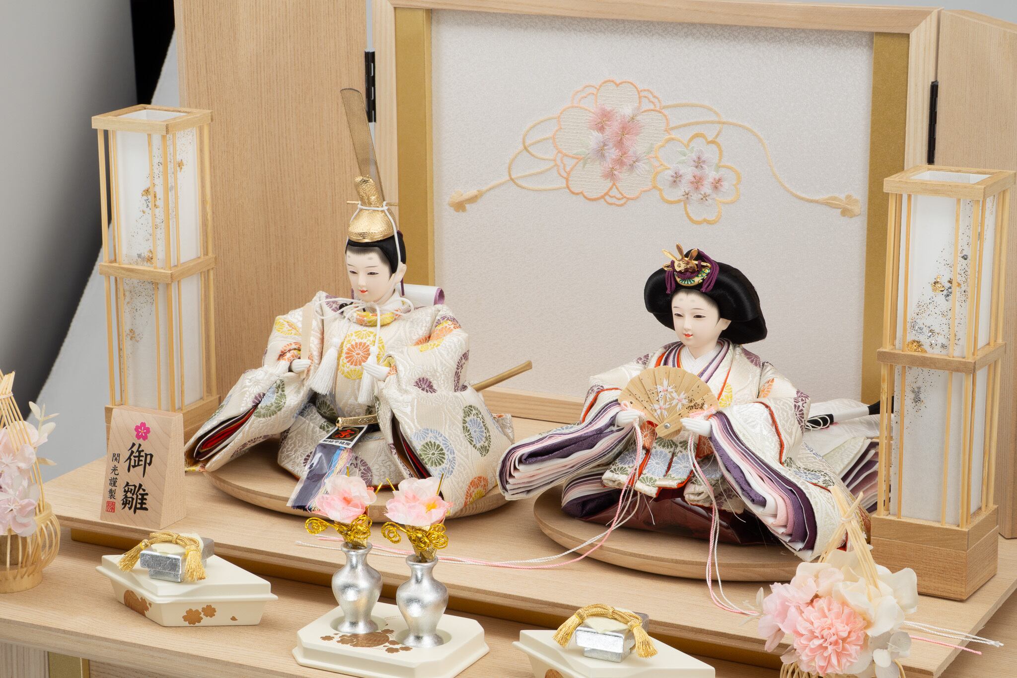 26S-01 彩鳳正絹 二人飾り 天然木タモ リボンに桜刺繍 収納飾りセット