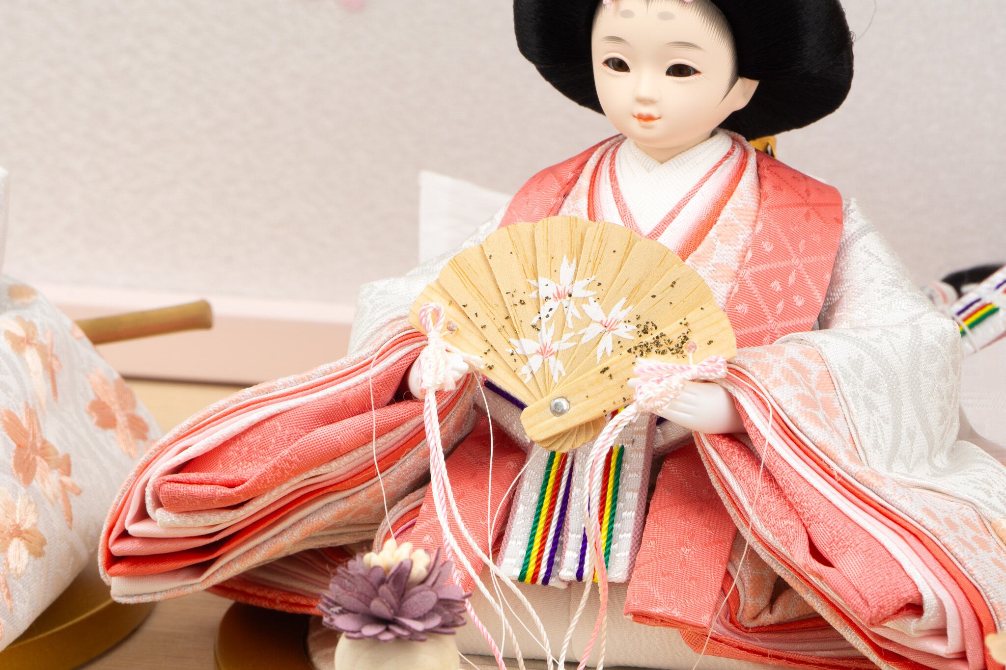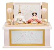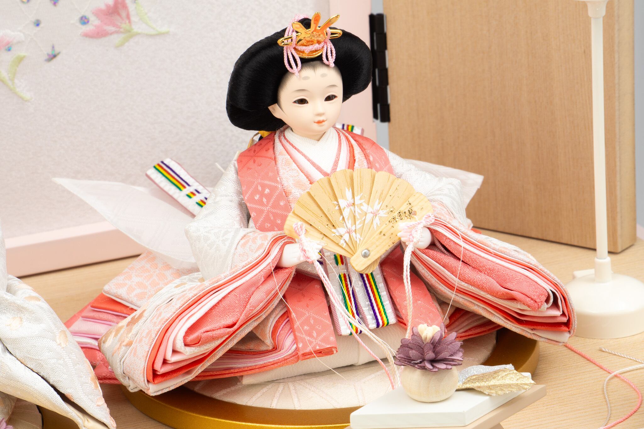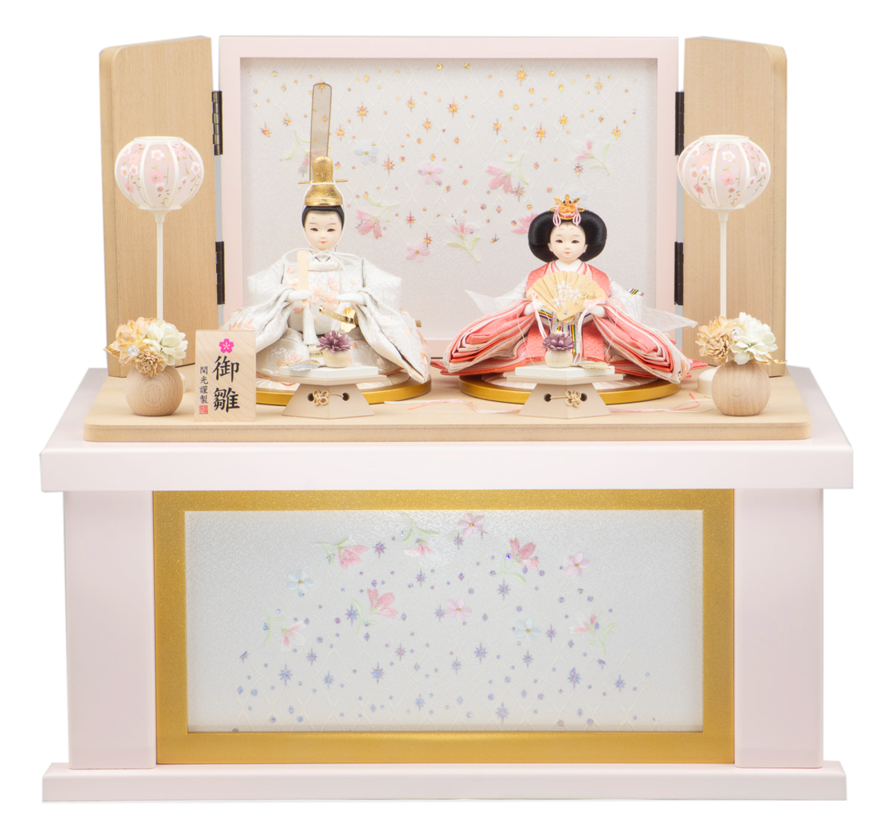 №26S-05 桃山 刺繍 二人飾り 桜色塗+タモ 雪輪に小花 収納飾りセット