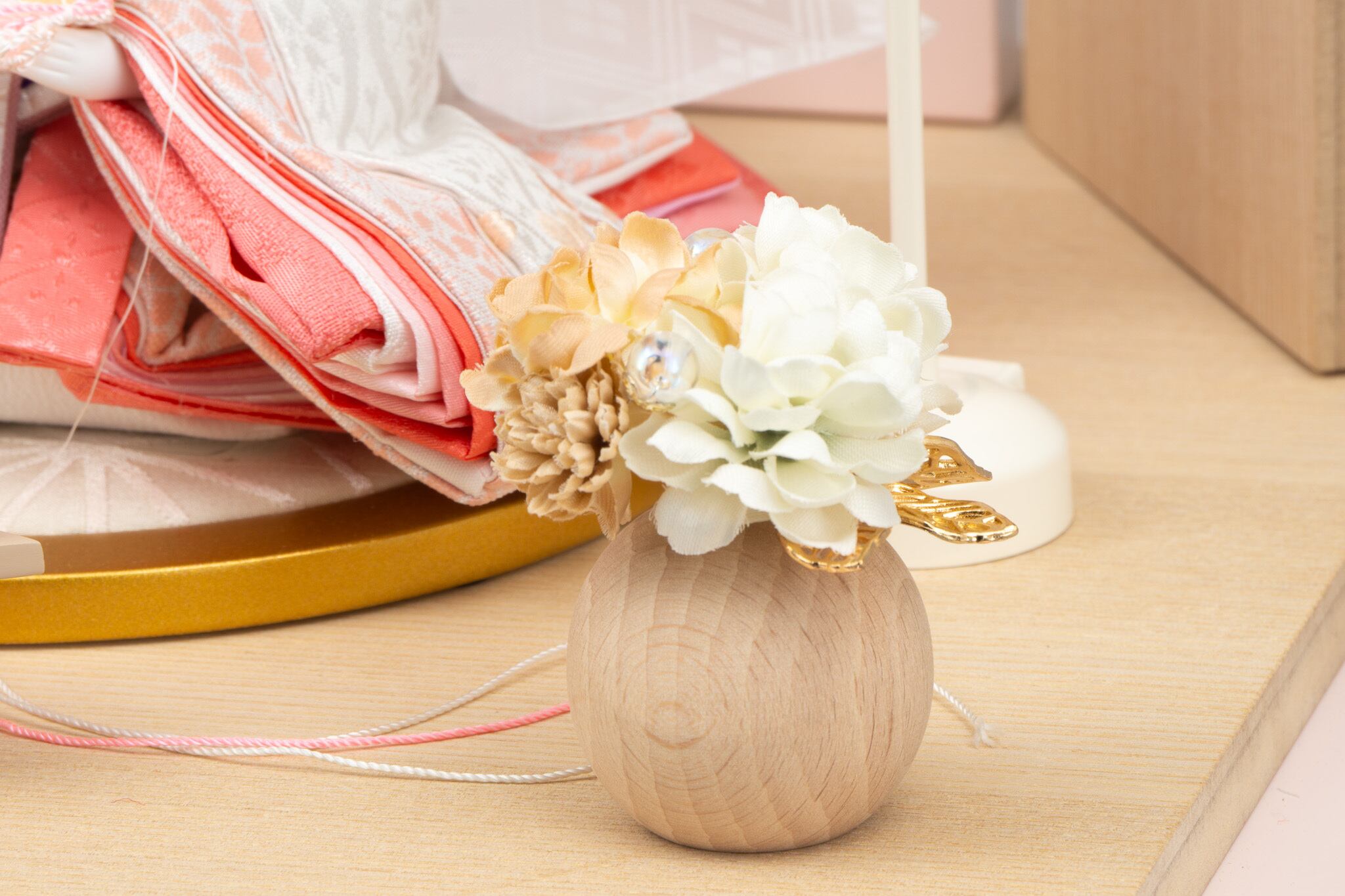 収納台には高級木材の桜と檜を使い、畳はモカとブラウンの市松柄。屏風と収納台には七宝と梅柄の刺繍が施された上品な高級収納飾りです。