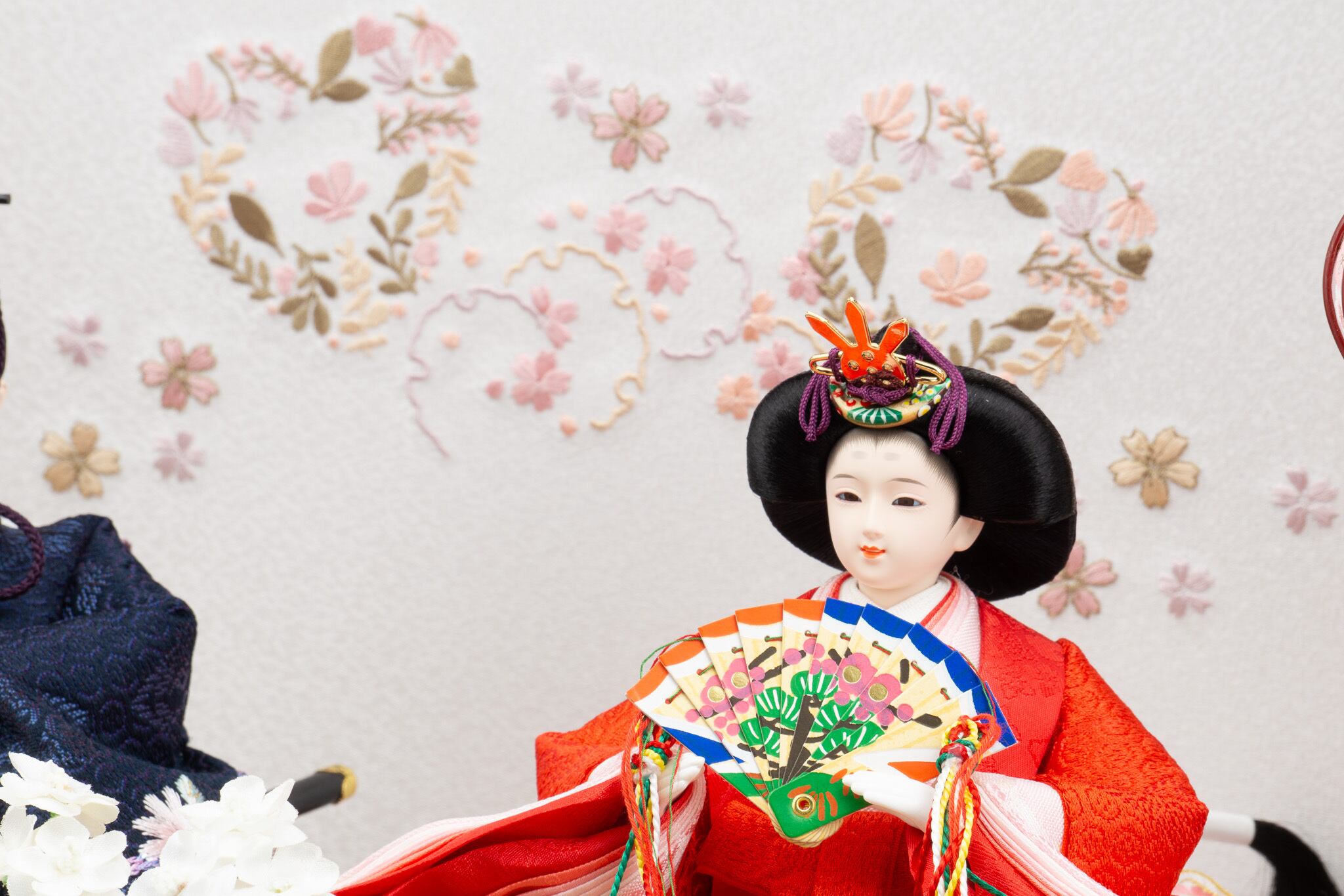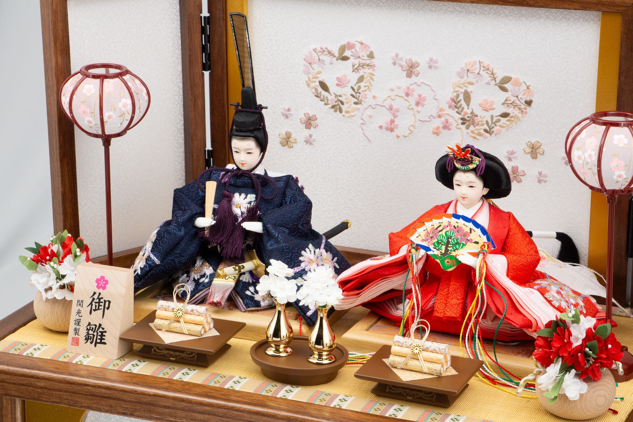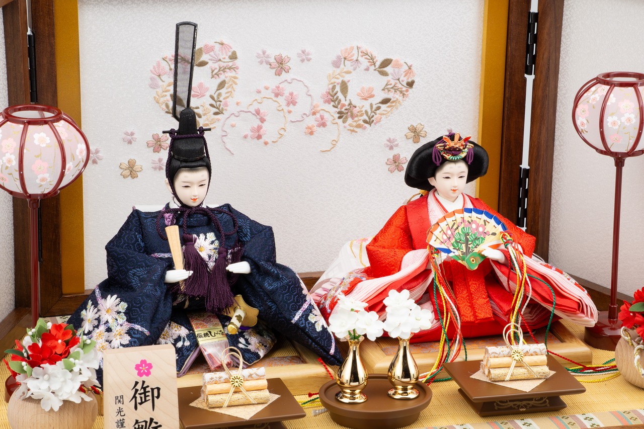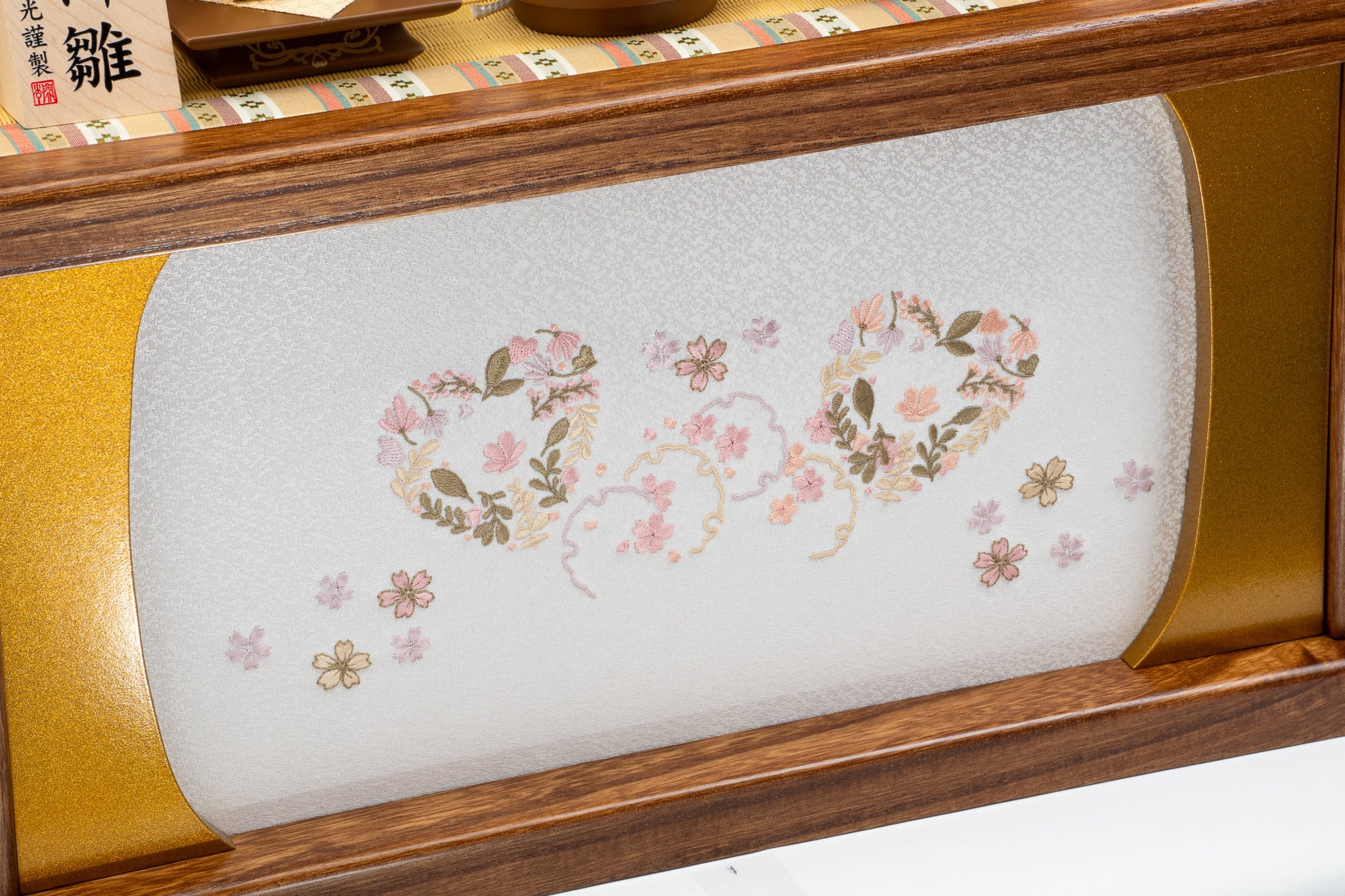 木目を活かしたライトオーク塗りに、金塗りの加飾を施したシンプルな三曲屏風の収納飾りです。ナチュラルな配色で、ハートをモチーフにした草花の刺繍がやさしい雰囲気を醸し出しています。男雛は紺色、女雛は朱色の金襴衣装をまとい、伝統的な趣を感じさせます。衣装には桜の刺繍が施され、華やかな印象を与えています
