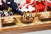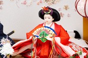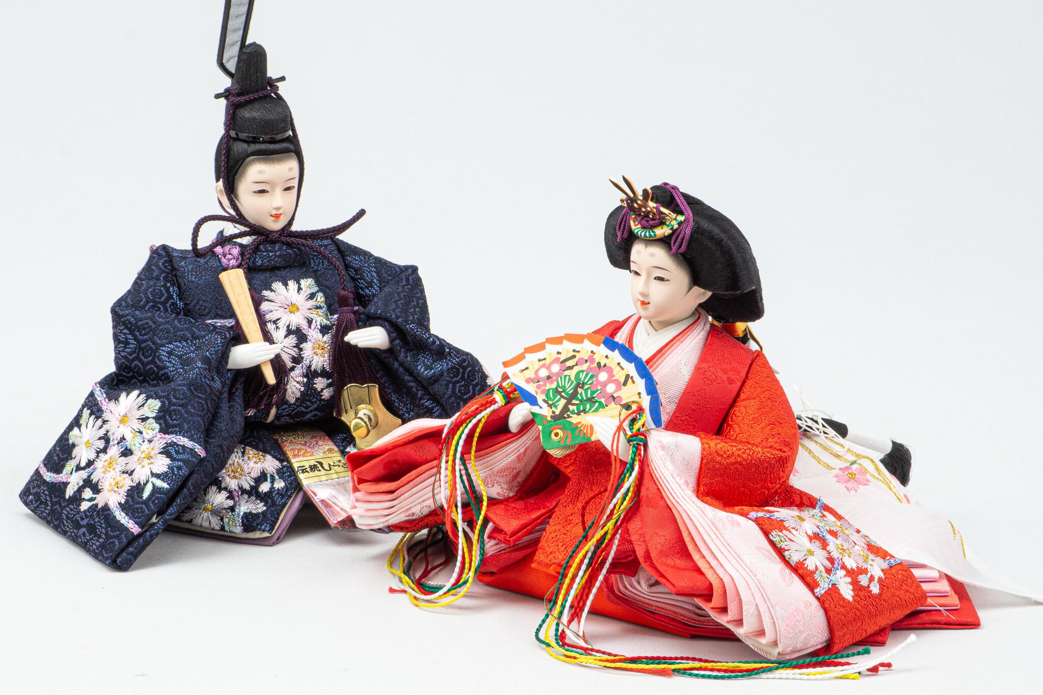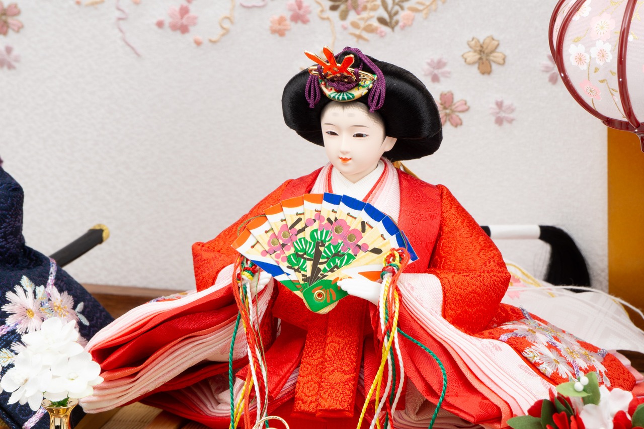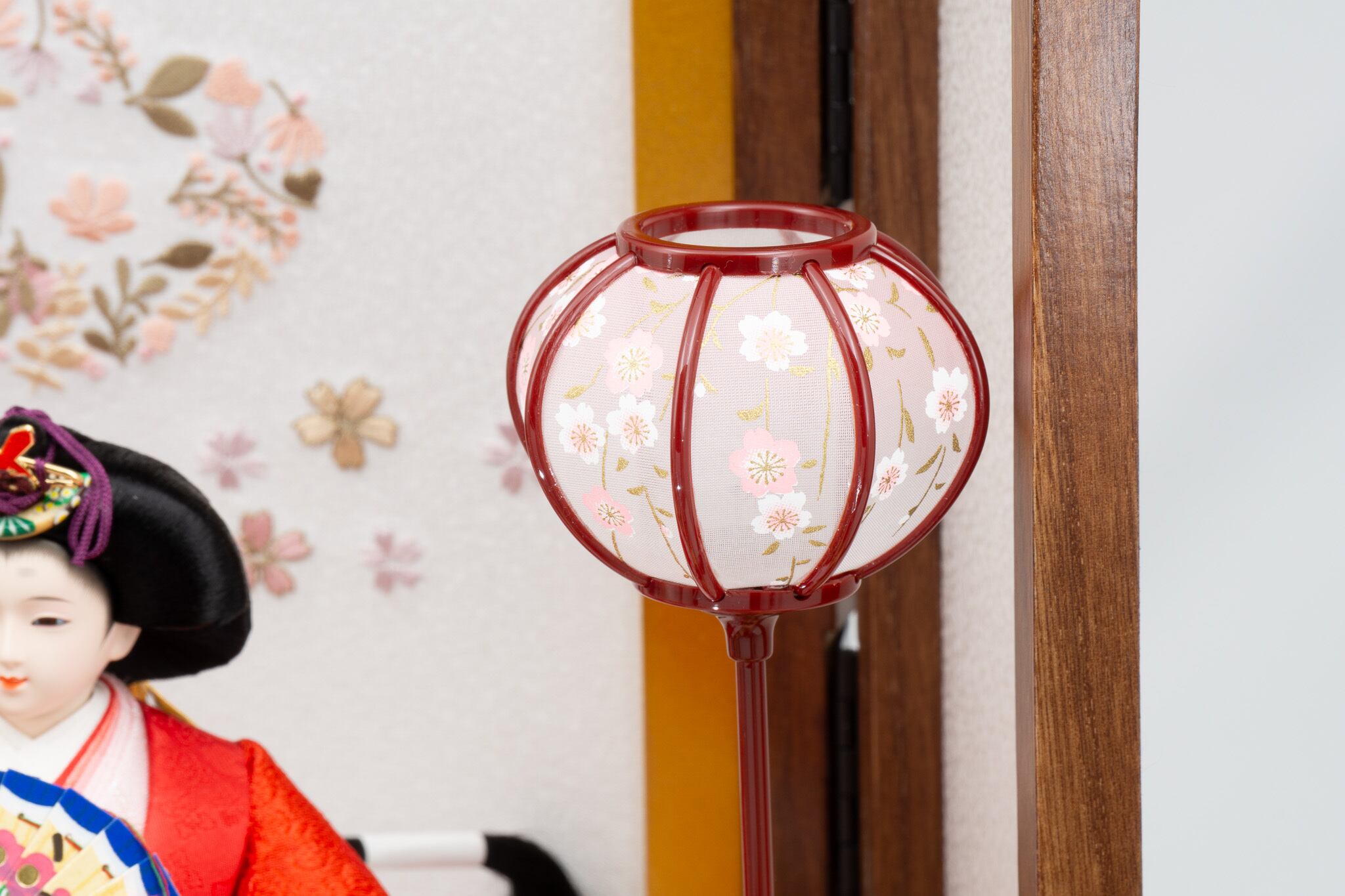 木目を活かしたライトオーク塗りに、金塗りの加飾を施したシンプルな三曲屏風の収納飾りです。ナチュラルな配色で、ハートをモチーフにした草花の刺繍がやさしい雰囲気を醸し出しています。男雛は紺色、女雛は朱色の金襴衣装をまとい、伝統的な趣を感じさせます。衣装には桜の刺繍が施され、華やかな印象を与えています