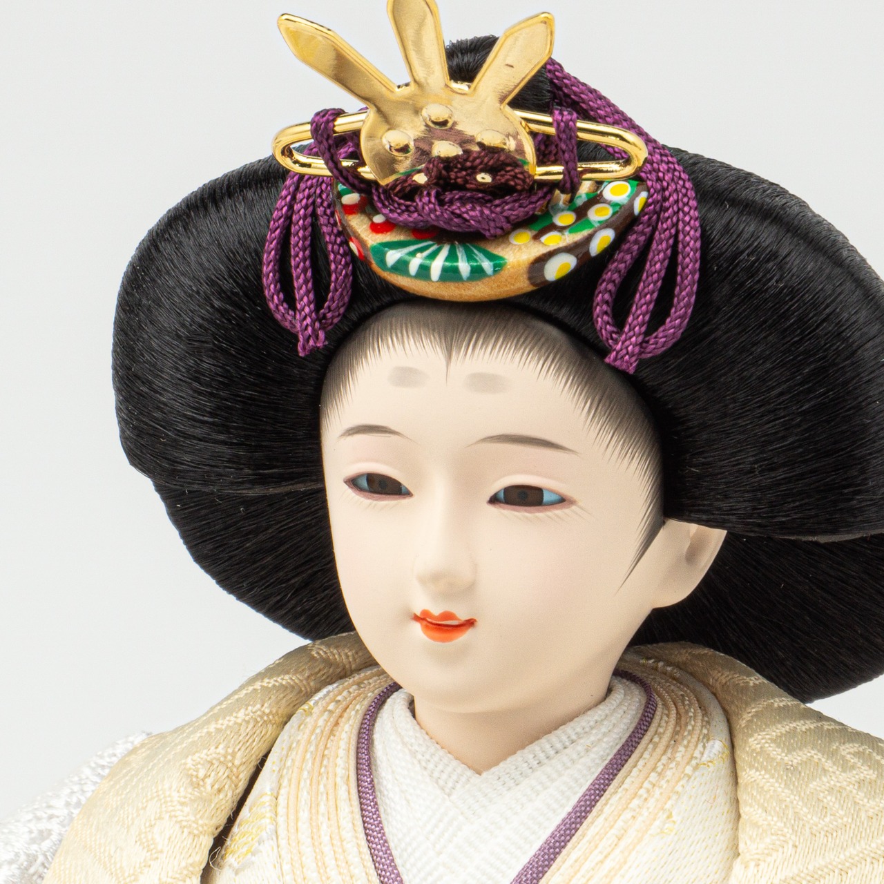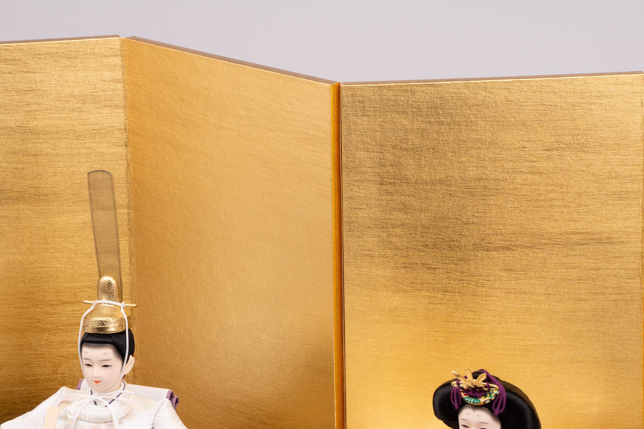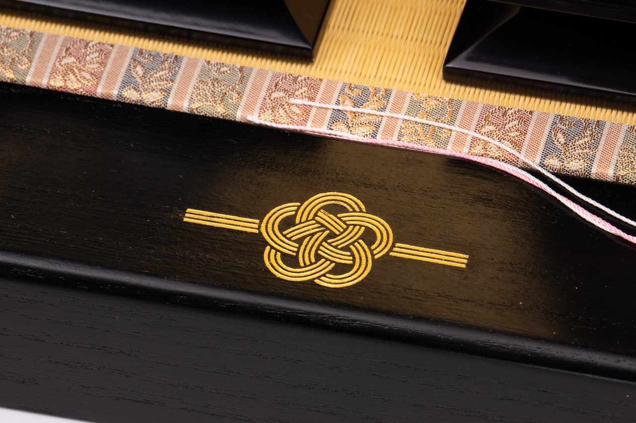 伝統的な金屏風の飾りですが、お人形が座る台は三層構造で高くしました。木目の黒塗り飾り台には水引柄の彫りを施し、金色で彩色することでモダンな雰囲気にアップデートしています。お人形は裾の伸びやかな瑞雲仕立てで、衣装はニュアンスカラーの刺繍が施されたオシャレなデザインです。末永くお飾りいただける飾りです