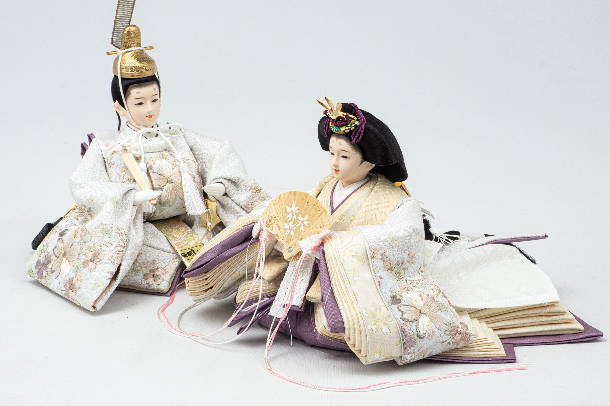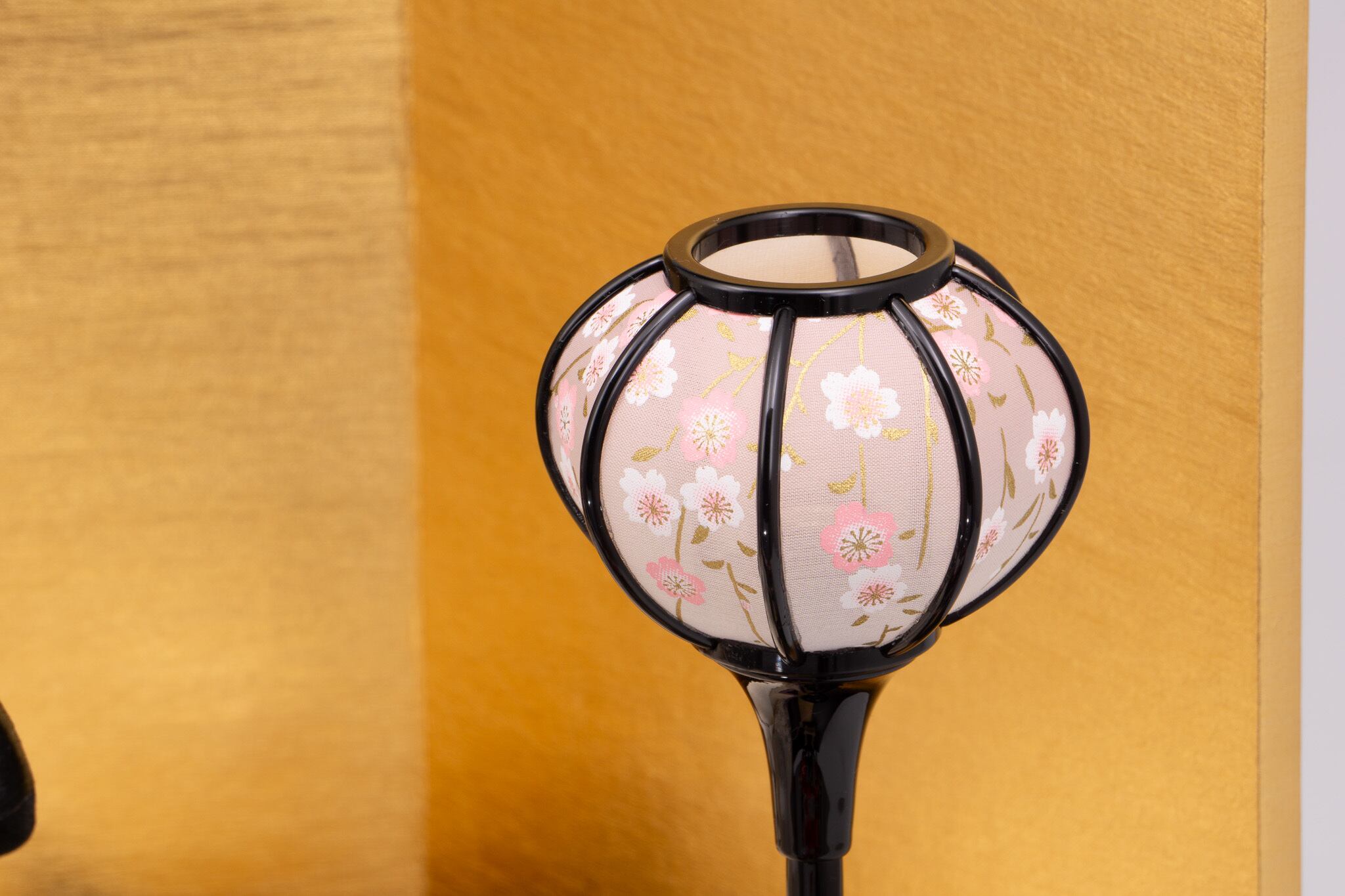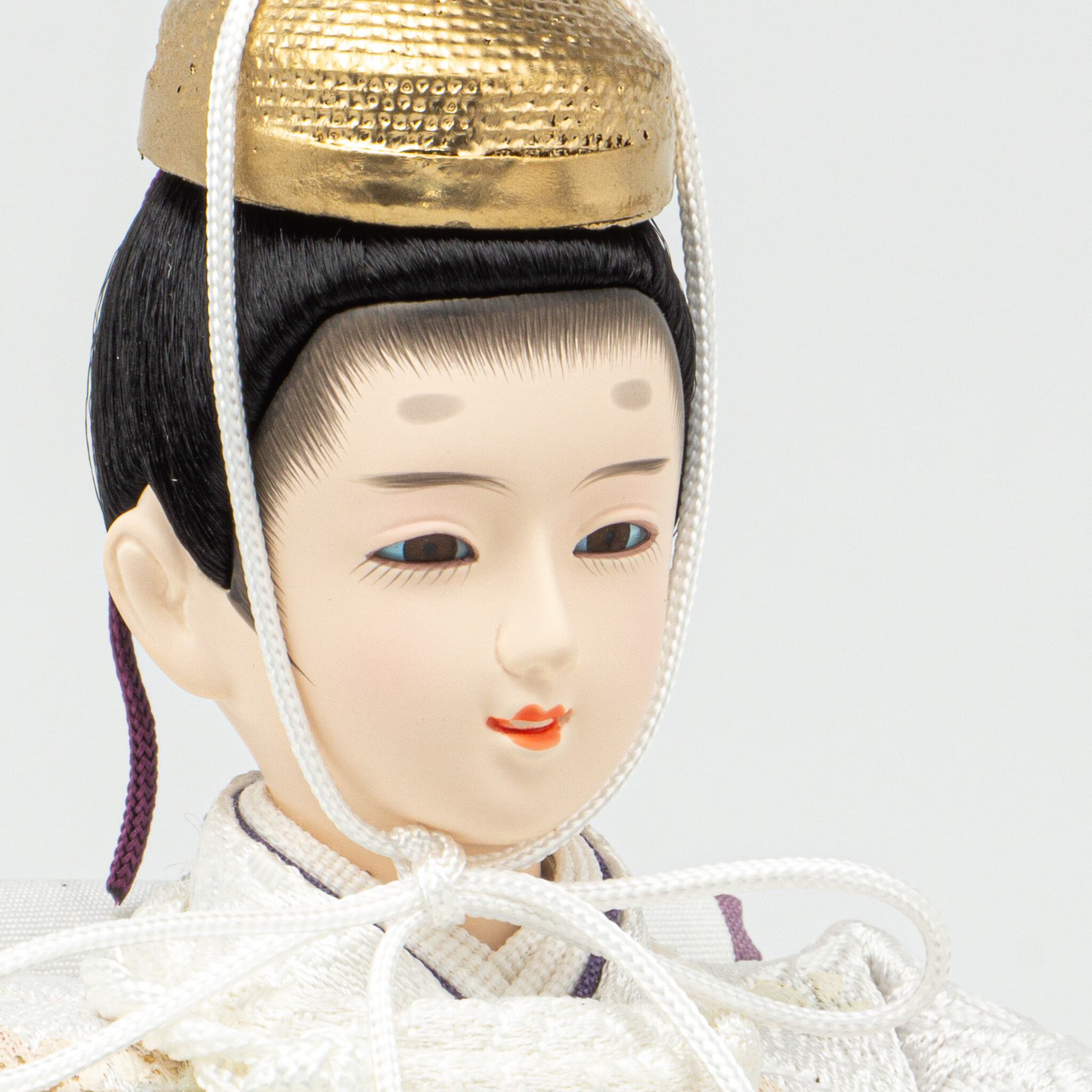 伝統的な金屏風の飾りですが、お人形が座る台は三層構造で高くしました。木目の黒塗り飾り台には水引柄の彫りを施し、金色で彩色することでモダンな雰囲気にアップデートしています。お人形は裾の伸びやかな瑞雲仕立てで、衣装はニュアンスカラーの刺繍が施されたオシャレなデザインです。末永くお飾りいただける飾りです