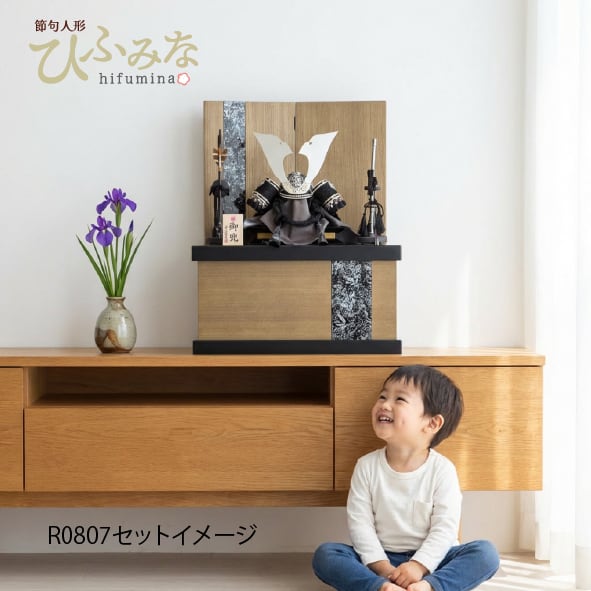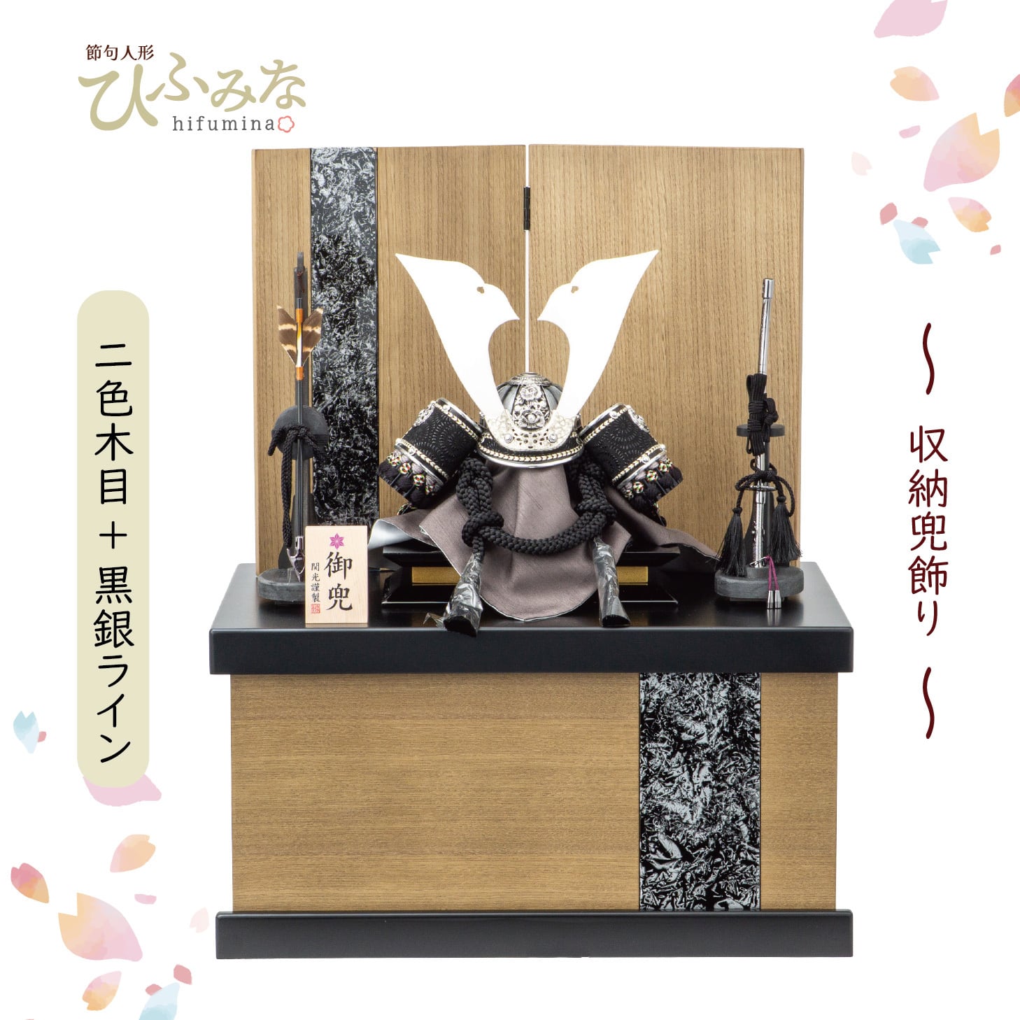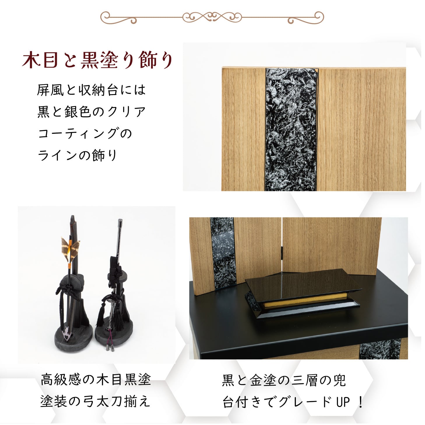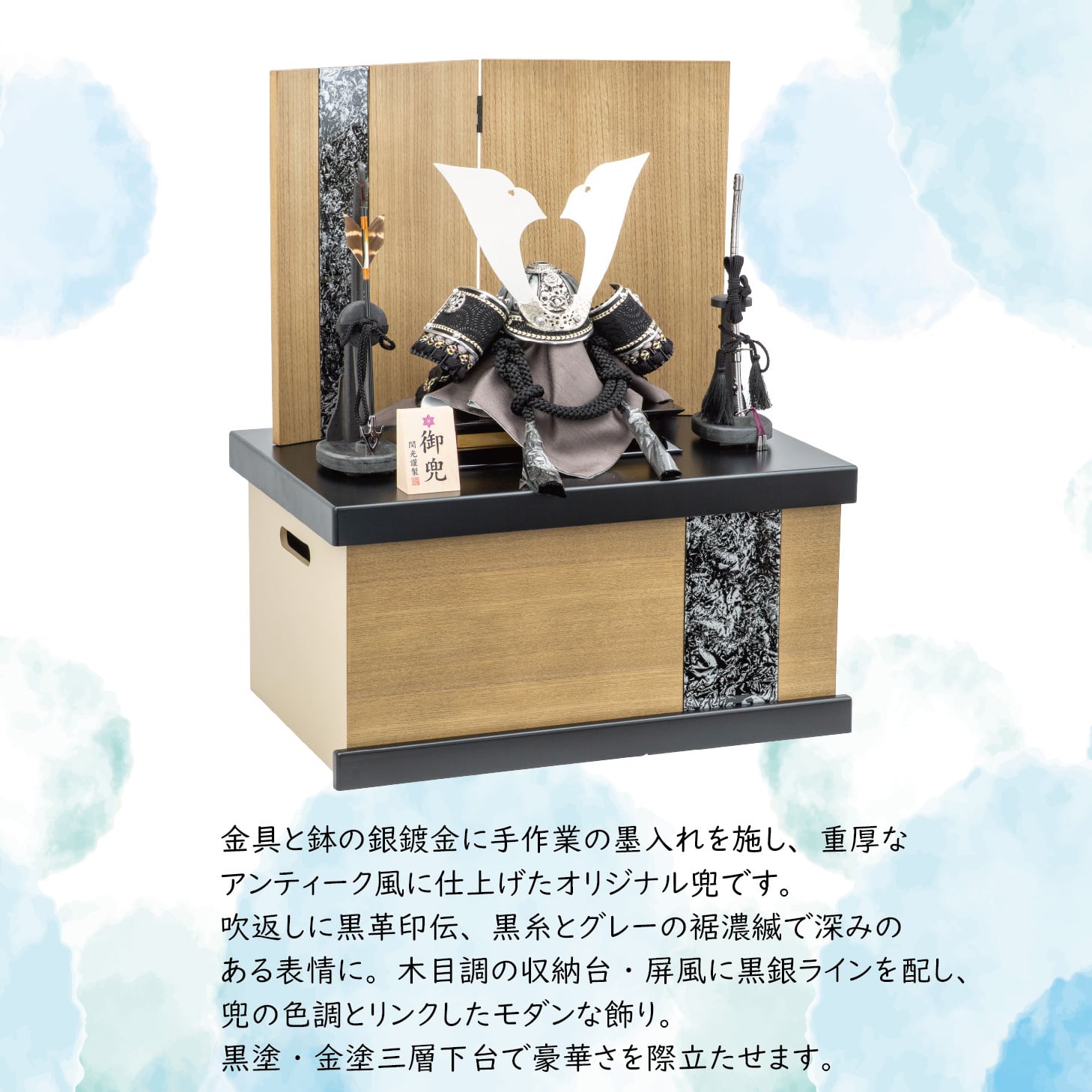 木目調の収納台・屏風に黒銀ラインを配し、兜の色調とリンクしたモダンな飾り。黒塗・金塗三層下台で豪華さを際立たせます。