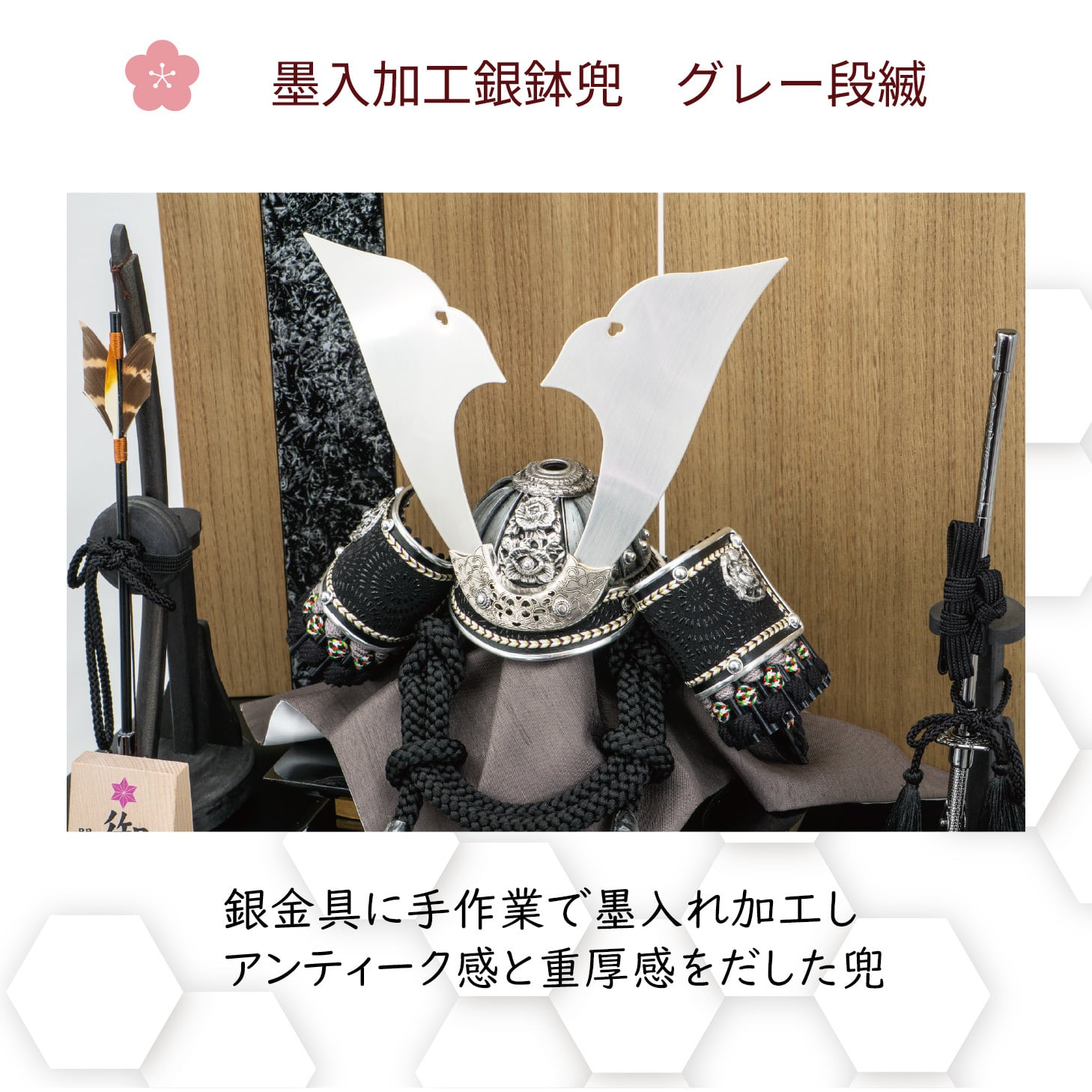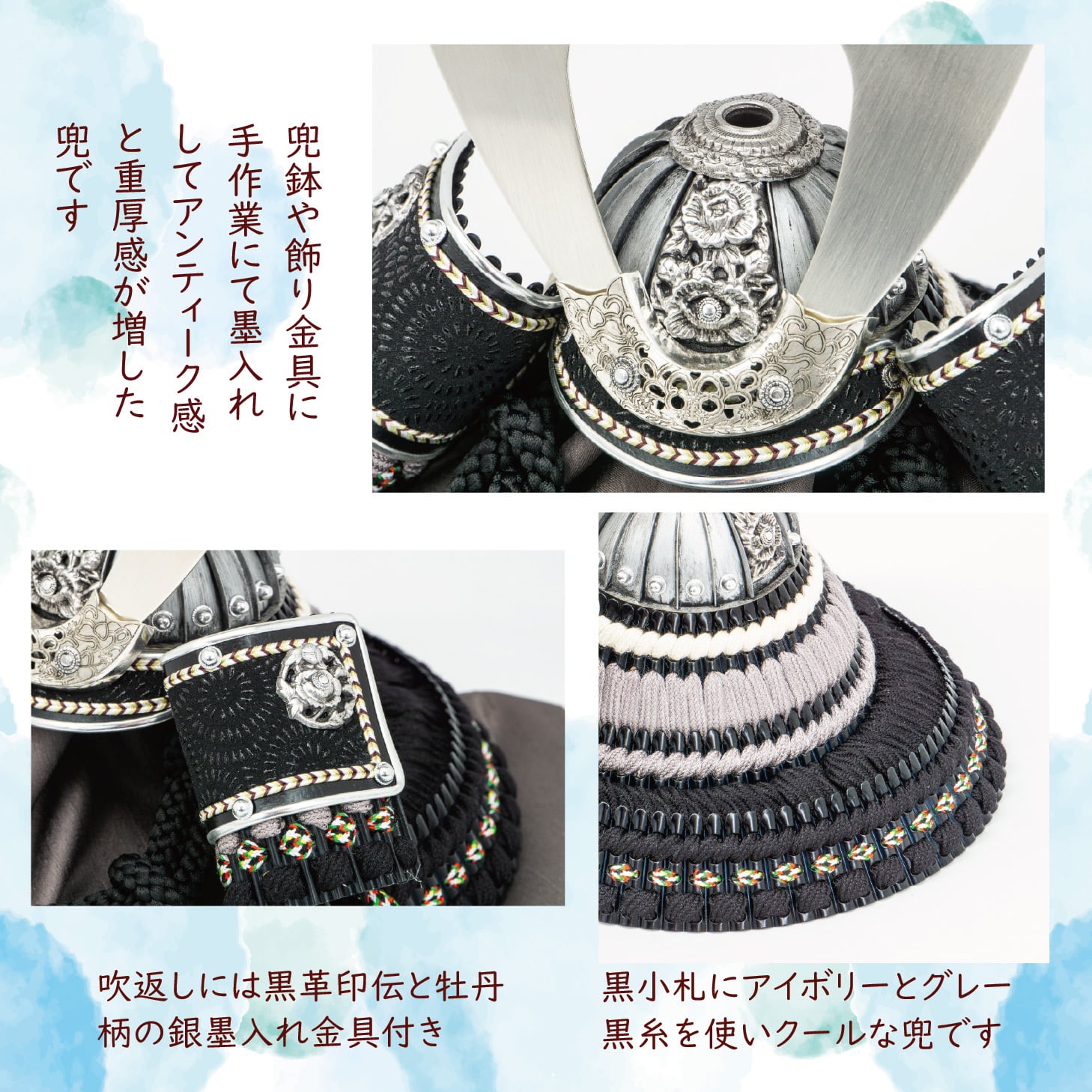 金具と鉢の銀鍍金に手作業の墨入れを施し、重厚なアンティーク風に仕上げたオリジナル兜です。吹返しに黒革印伝、黒糸とグレーの裾濃縅で深みのある表情に。