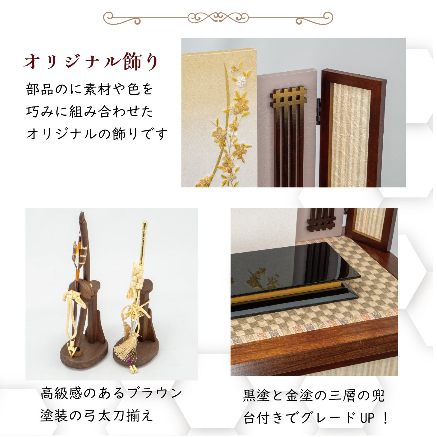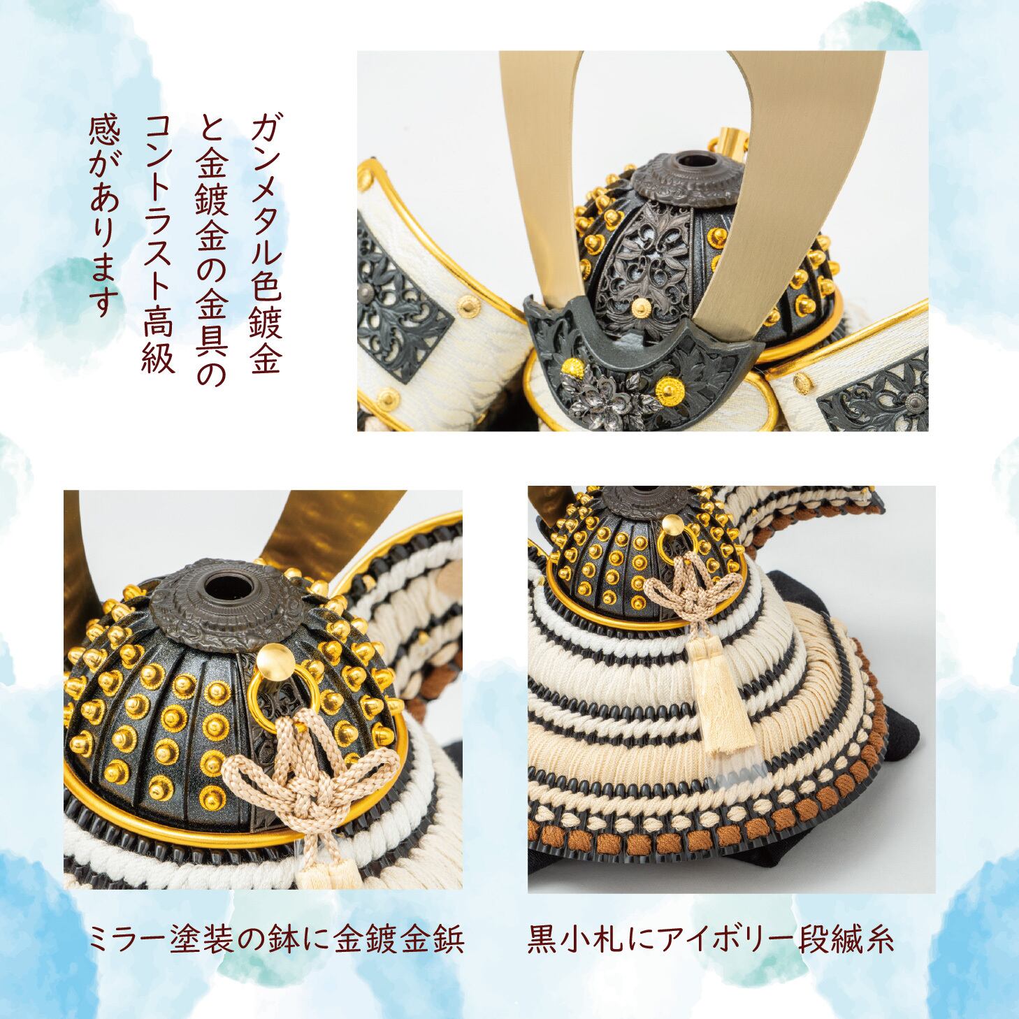 黒塗と金塗を三段重ねにした兜下台が豪華さを際立たせます。