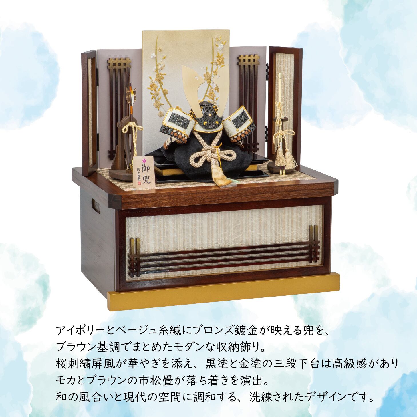 現代的な色アイボリーとベージュ糸縅にブロンズ鍍金がカッコいい兜をオシャレな収納飾りにしました。