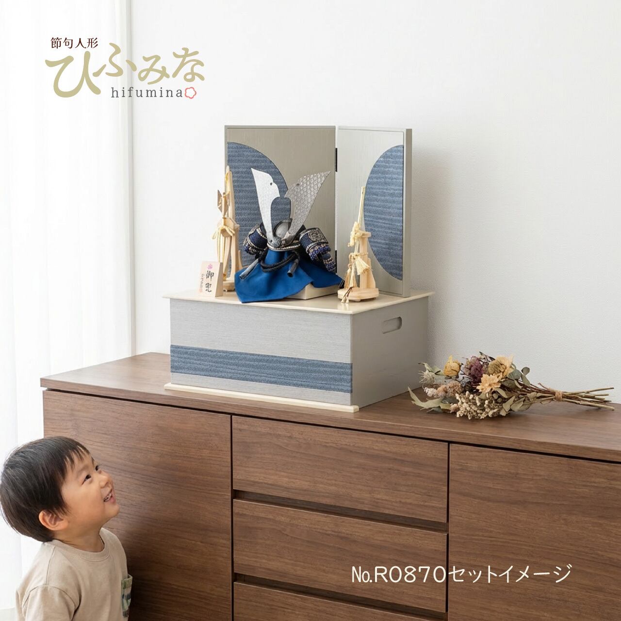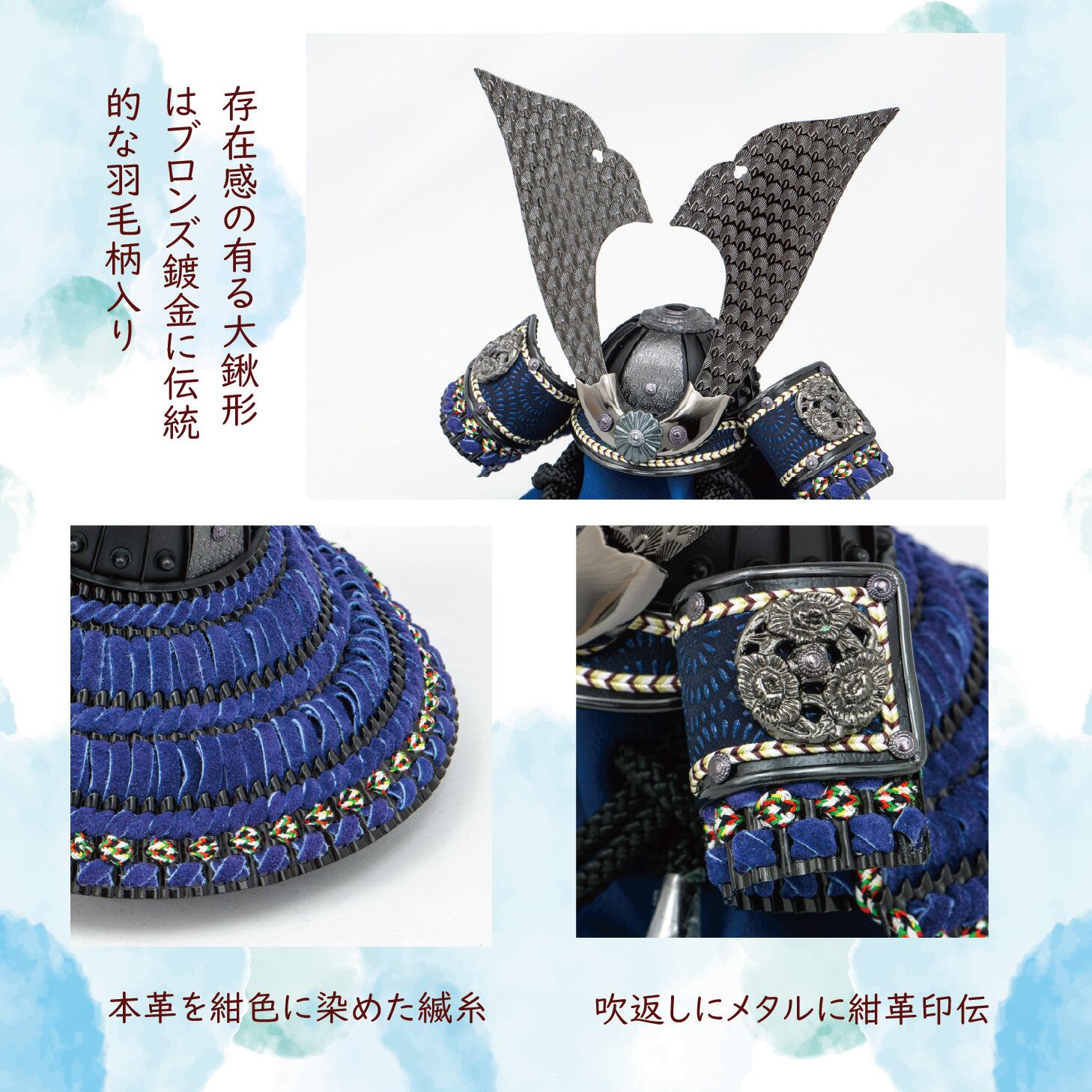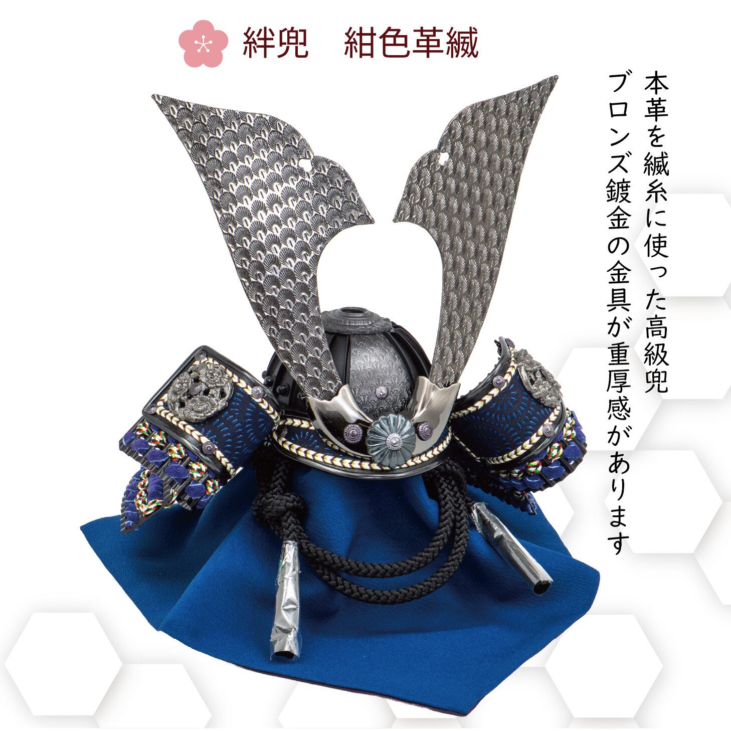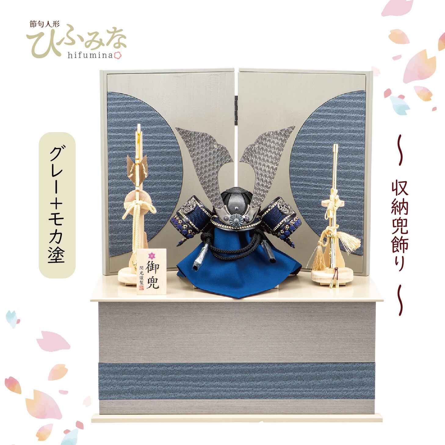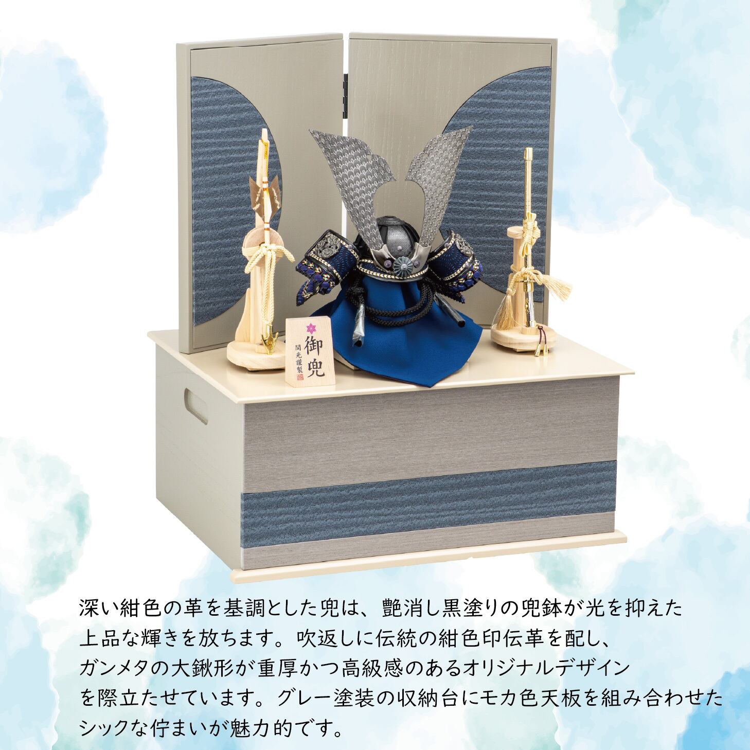 深い紺色の革を基調とした兜は、艶消し黒塗りの兜鉢が光を抑えた上品な輝きを放ちます。吹返しに伝統の紺色印伝革を配し、ガンメタの大鍬形が重厚かつ高級感のあるオリジナルデザインを際立たせています。グレー塗装の収納台にモカ色天板を組み合わせたシックな佇まいが魅力的で、青色和紙の素材感あるアクセントが屏風と調和し、現代の空間に息づく収納兜飾りです。