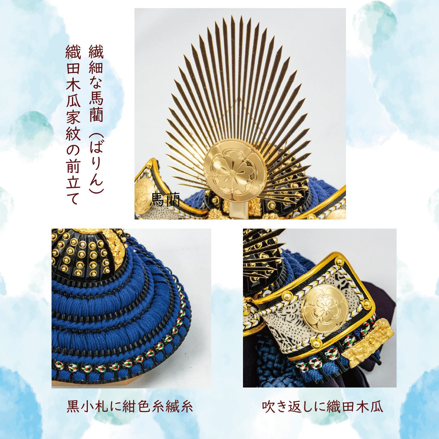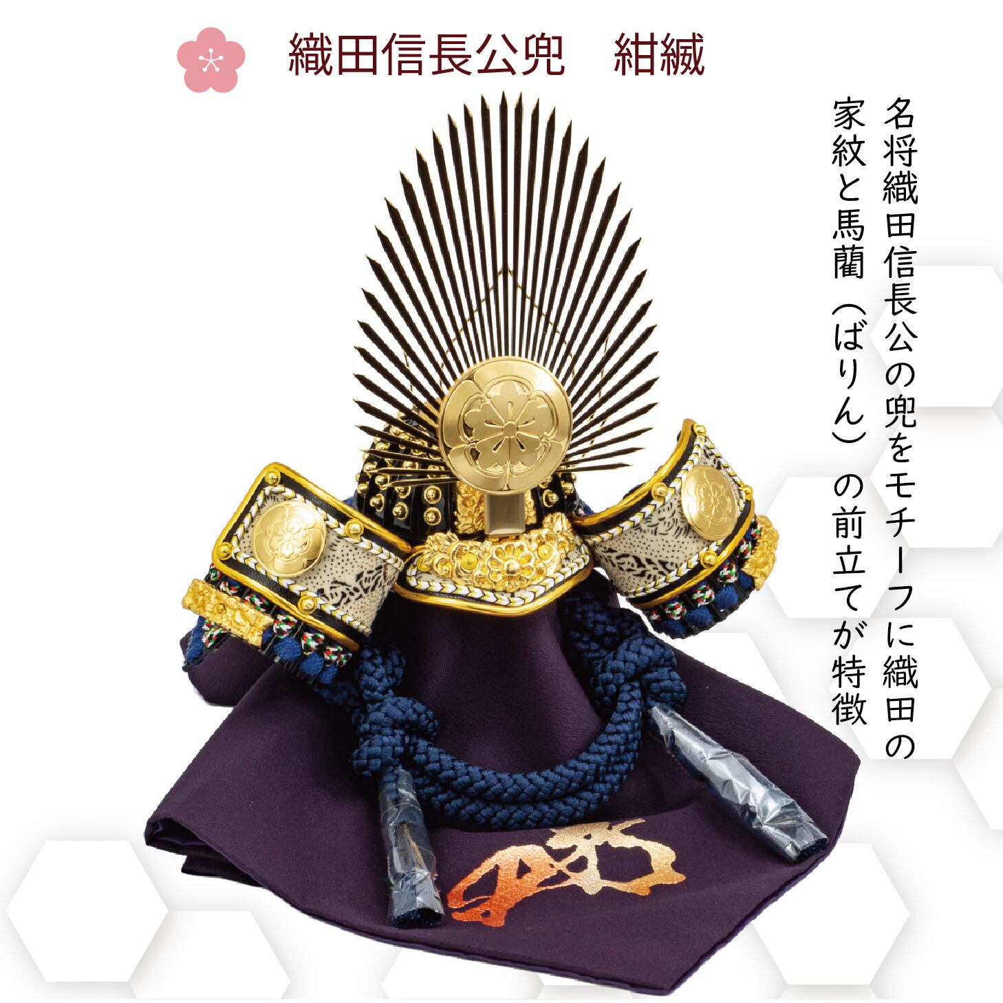 名将・織田信長公の兜をモチーフに、紺糸縅で丁寧に製作した兜飾りです。