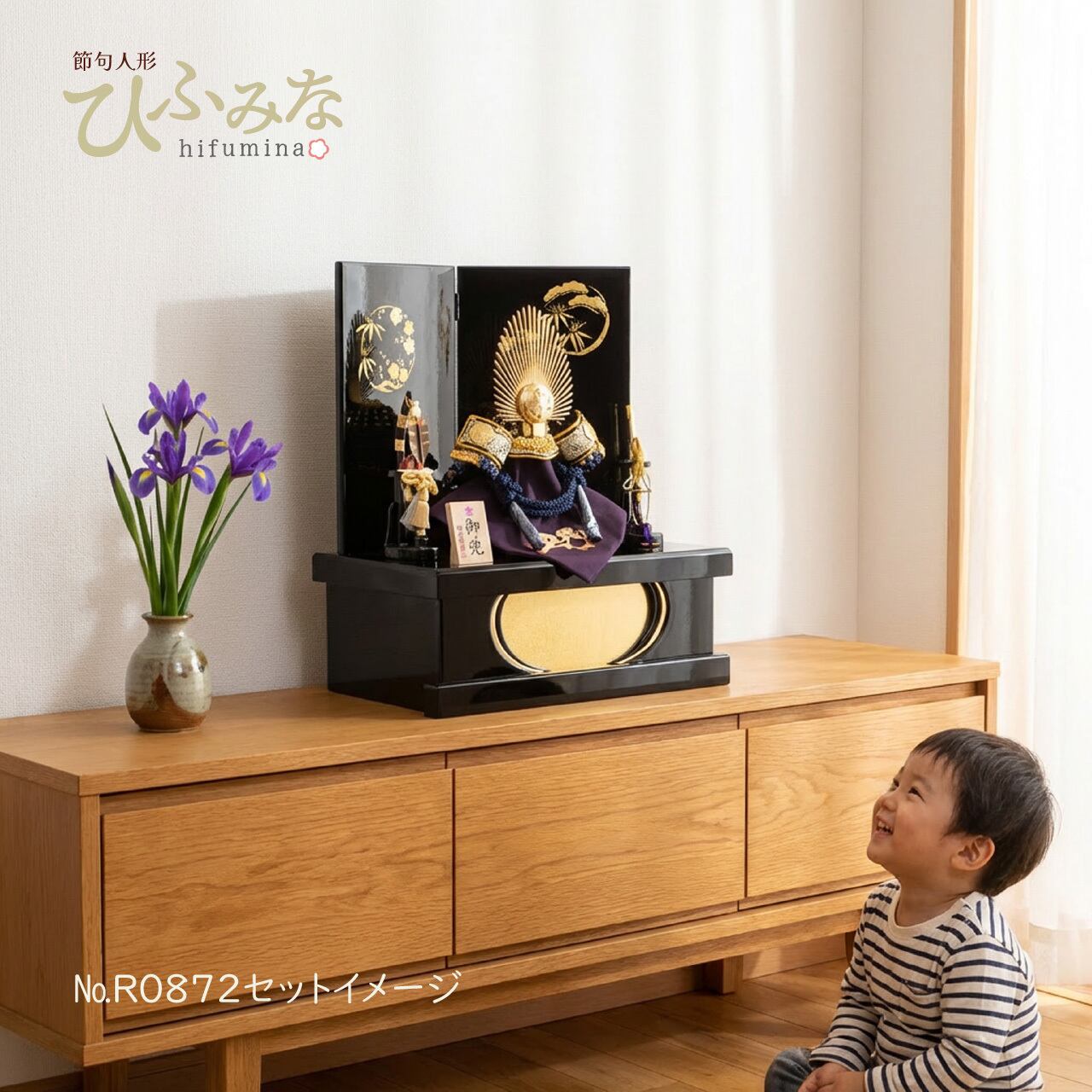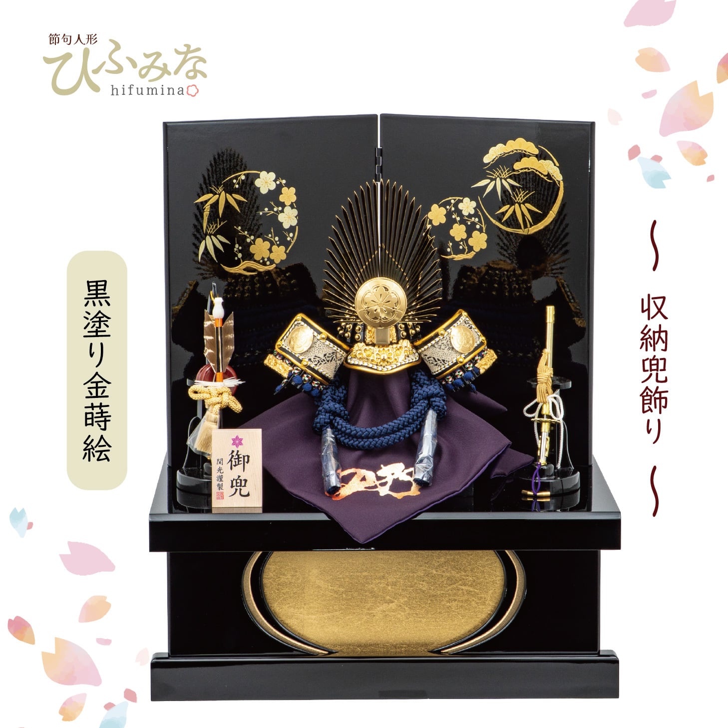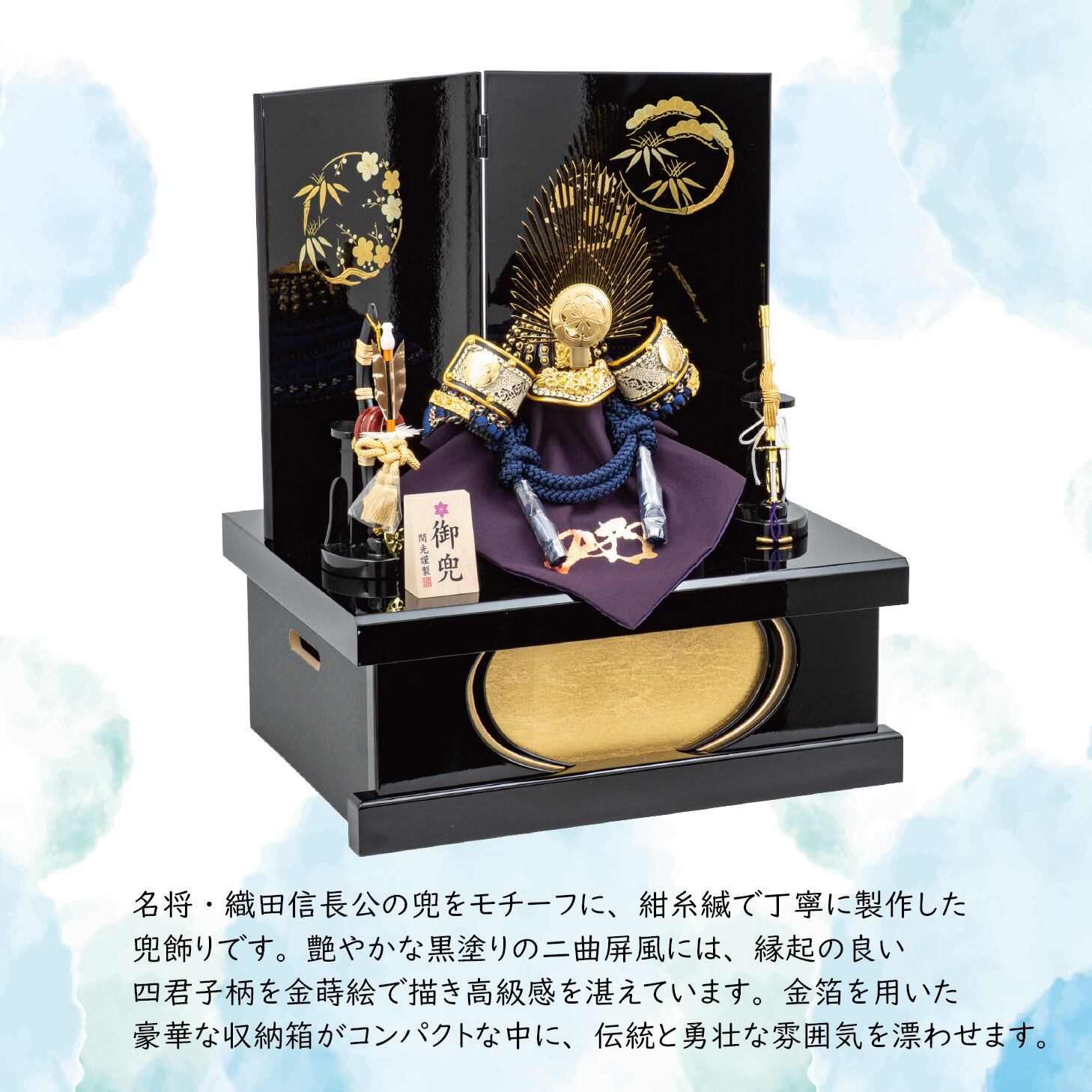 艶やかな黒塗りの二曲屏風には、縁起の良い四君子柄を金蒔絵で描き高級感を湛えています。金箔を用いた豪華な収納箱がコンパクトな中に、伝統と勇壮な雰囲気を漂わせます。