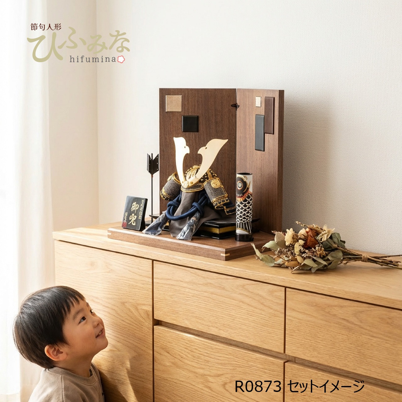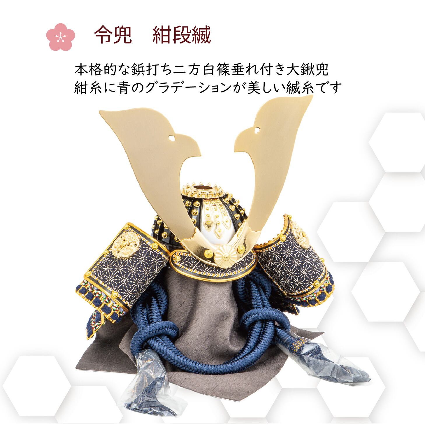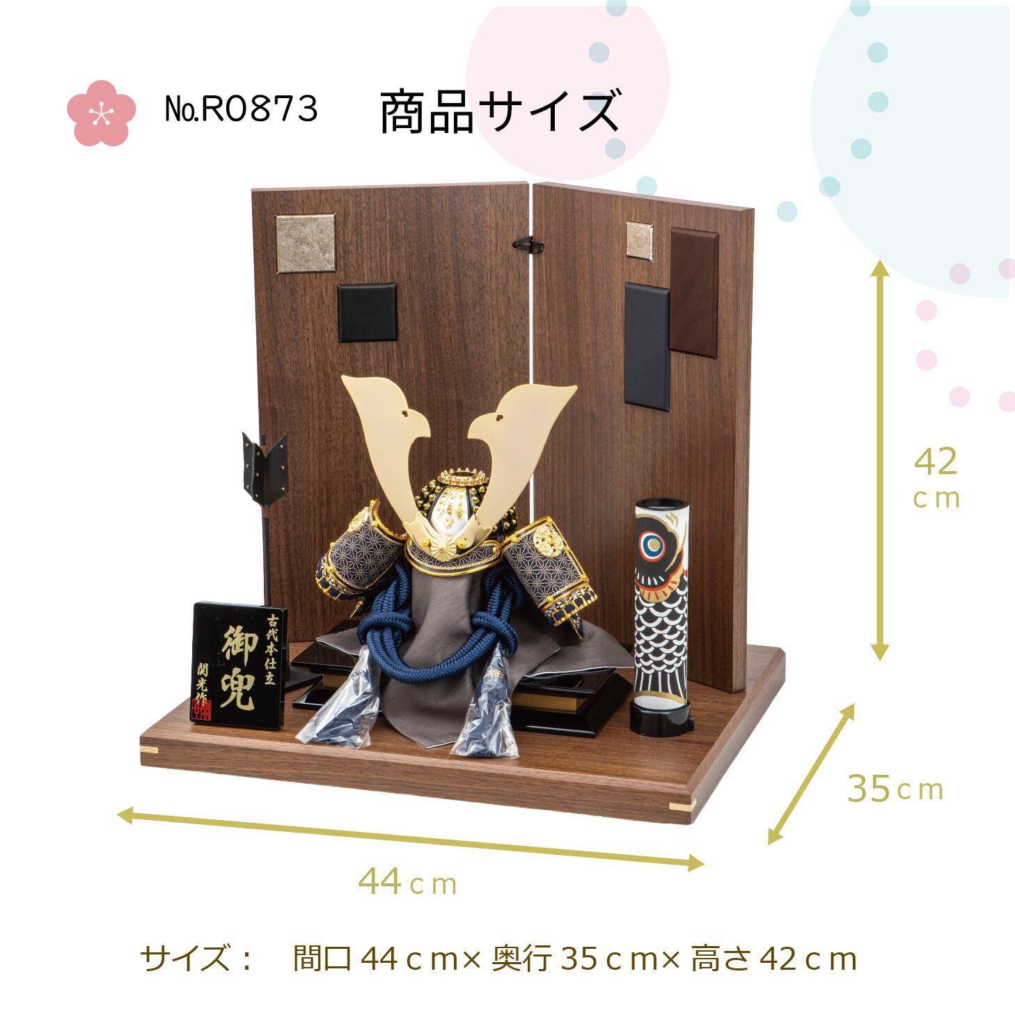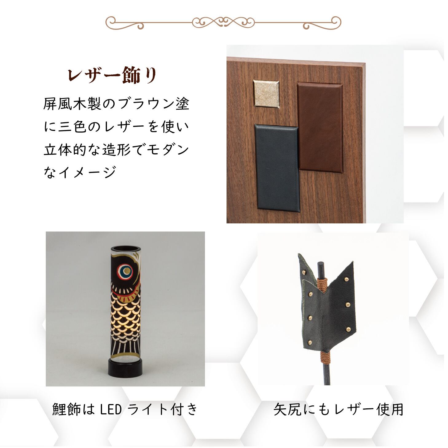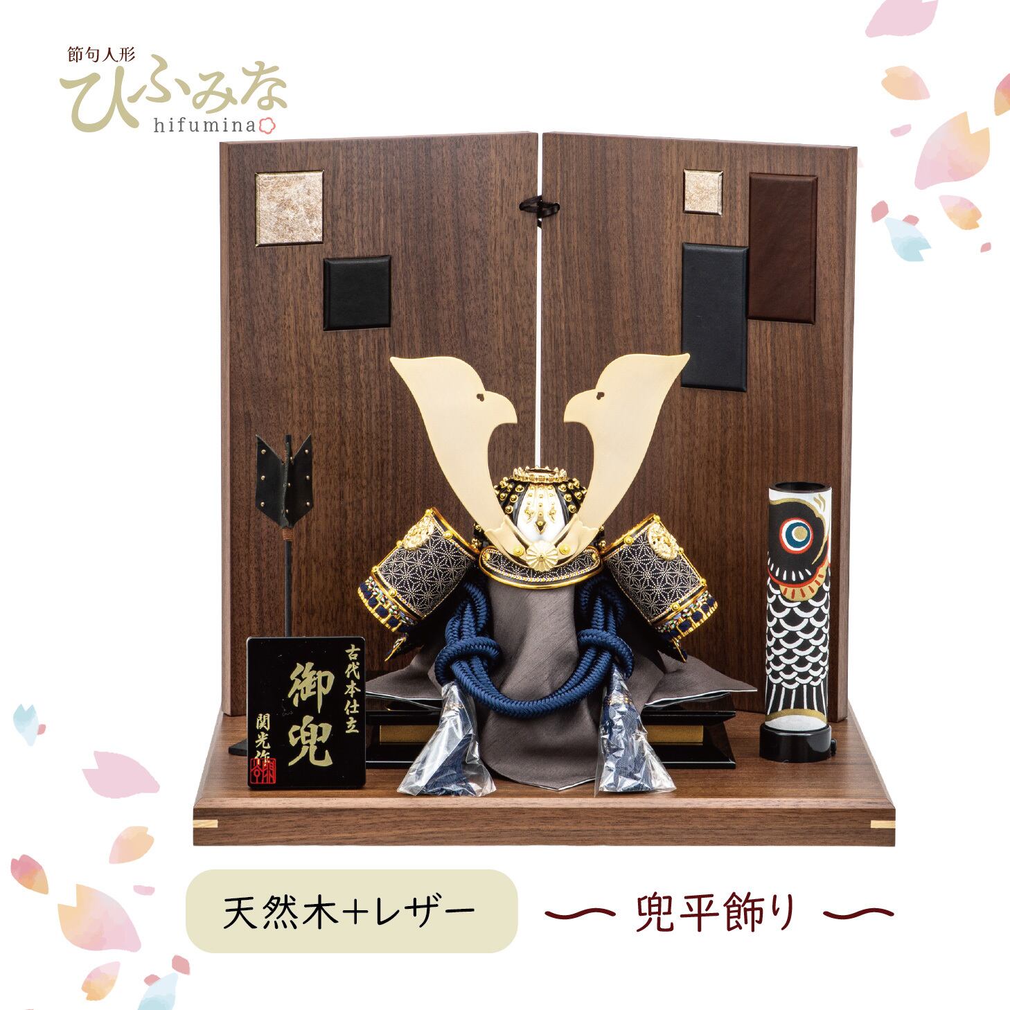 細部まで緻密に仕上げた紺色の段縅兜を、ウォールナット色の飾り台・屏風に飾りました。屏風には3種類のレザーを用いたモダンなデザイン、矢尻もレザー仕上げの高級仕様です。鯉のぼりはLEDコードレスでほんのり灯る、洗練された兜飾りです。
