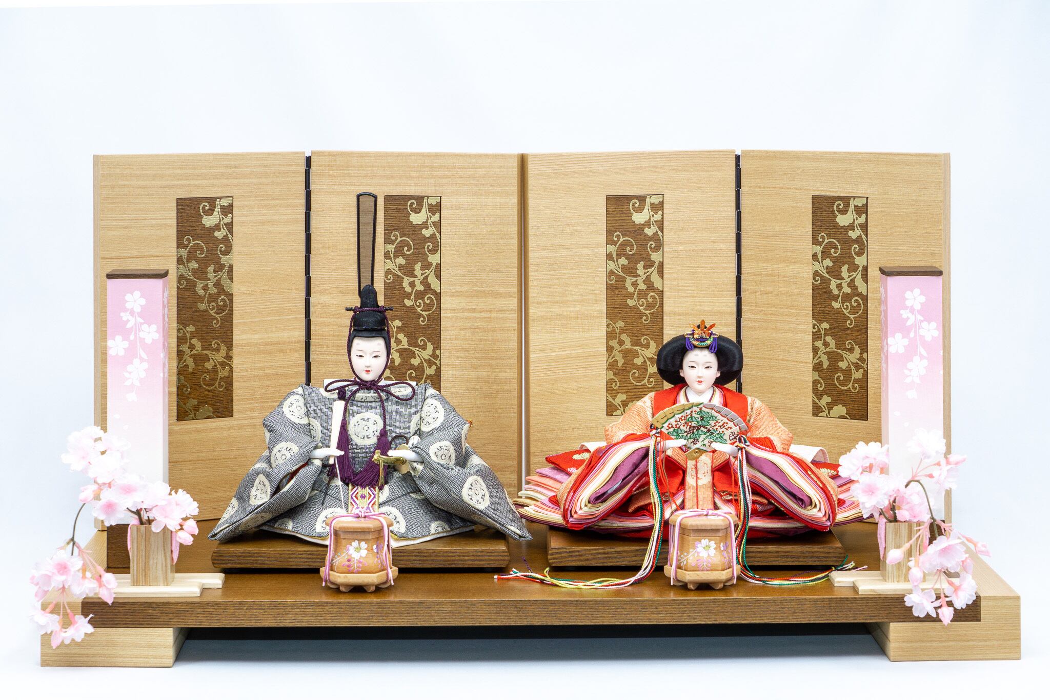 古典柄の高級裂地のお人形と洗練された木目も飾り台と屏風がシックにマッチし上品なおひなさま飾りです。