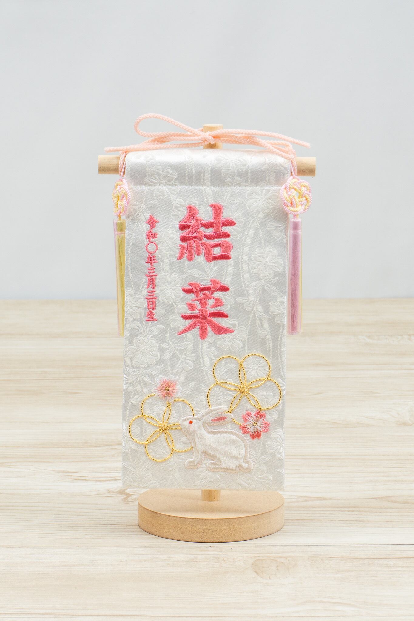 桜とウサギさんを刺繍、梅柄を金駒刺繍で描きオシャレなお名前旗