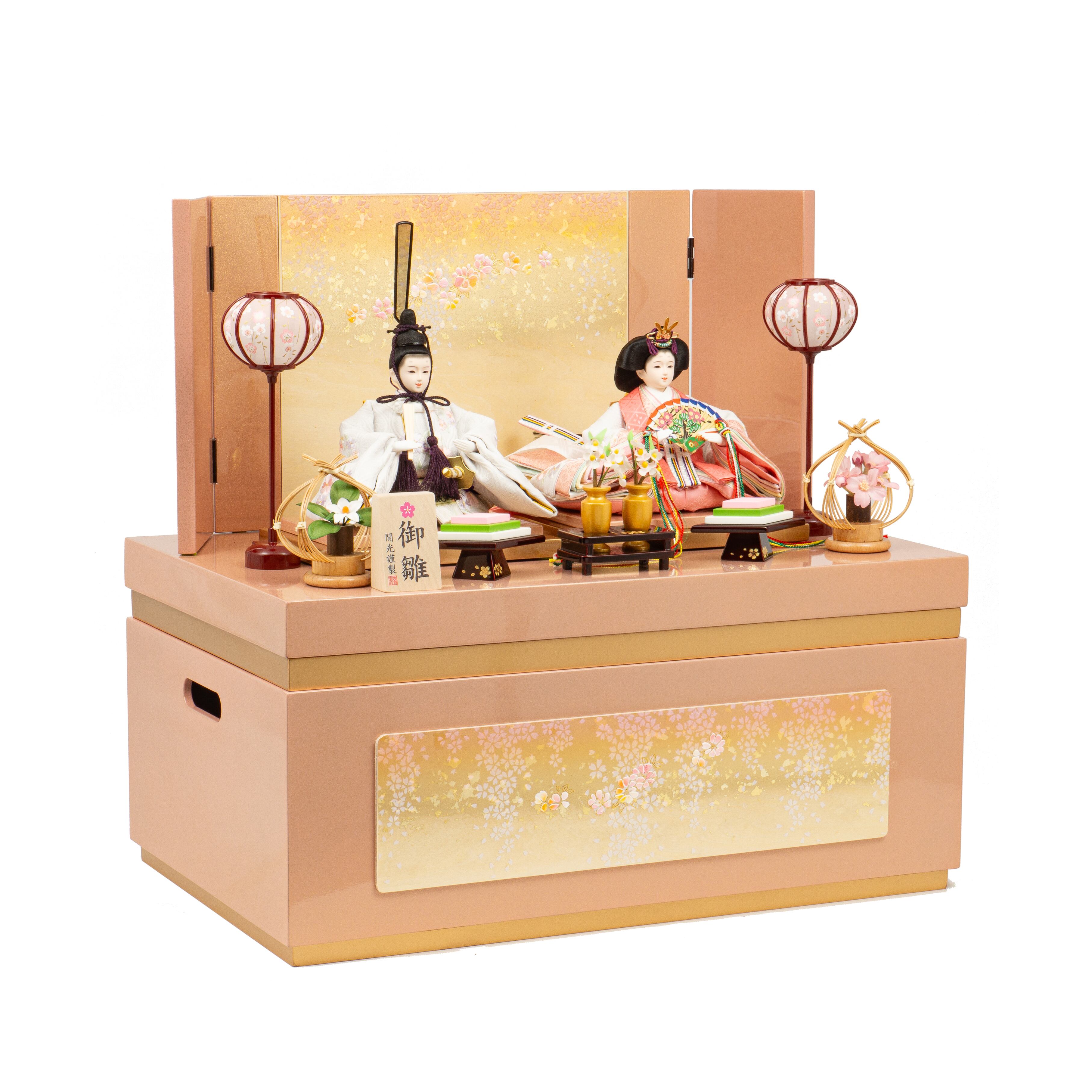 №25S-07 瑞雲 刺繍 二人飾り パールジェルピンク塗 金彩桜ちらし 収納飾りセット