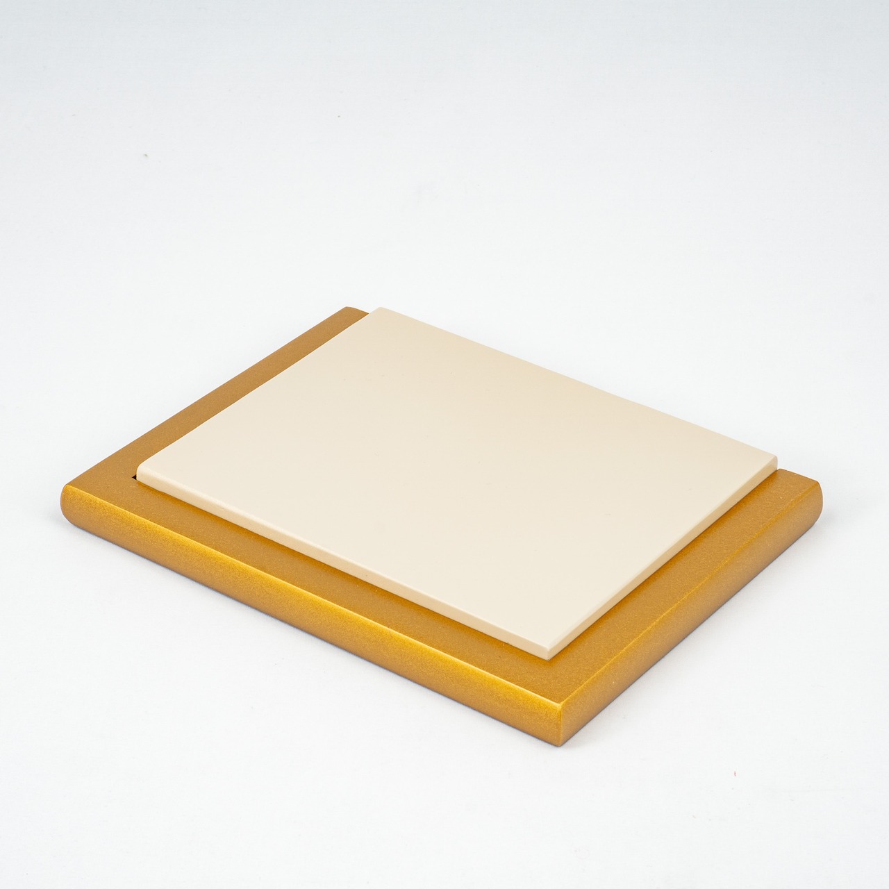 十二単衣を八枚重ねた豪華な造りのオリジナルおひなさま、西陣織金襴に柔らかな色合いで桜の刺繍を施し朱色の袴と襟でおひなさまらしさを出しました。屏風はオリジナルのデザインで額縁の中に高級な京都の金彩で月と桜を描き、塗色をモカ色で仕上げモダンの中に伝統美がある飾りです。